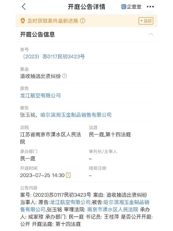 最终,金东投资将龙江航空告到哈尔滨中院。