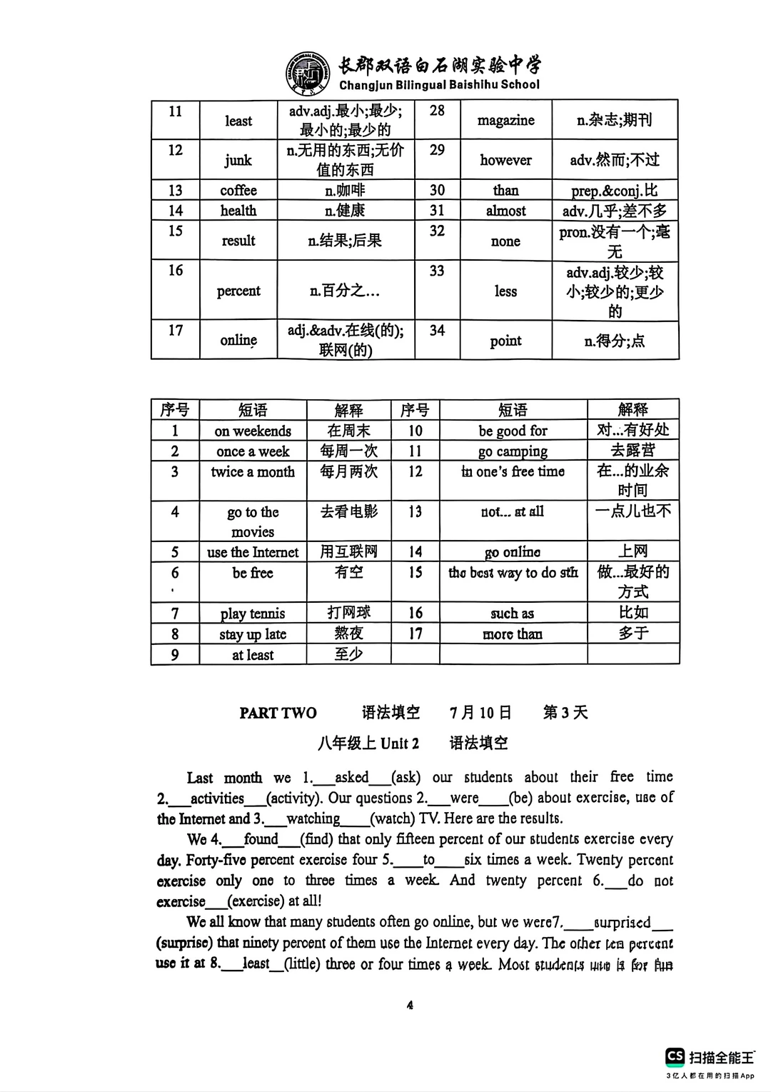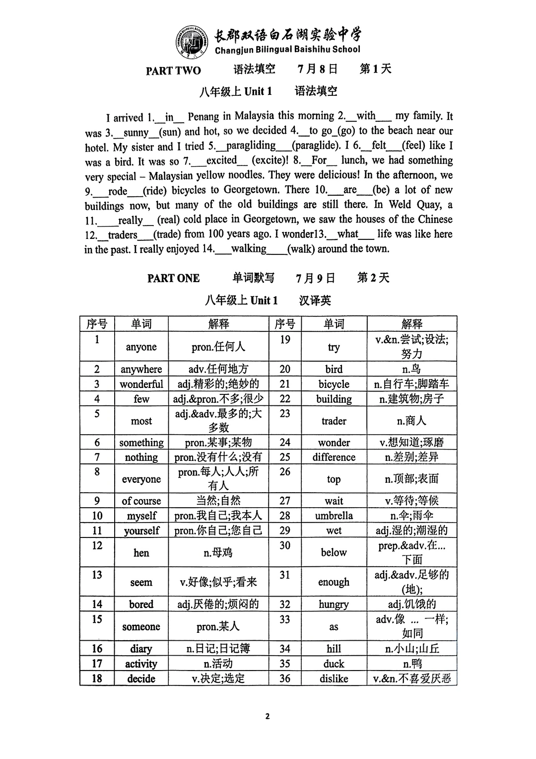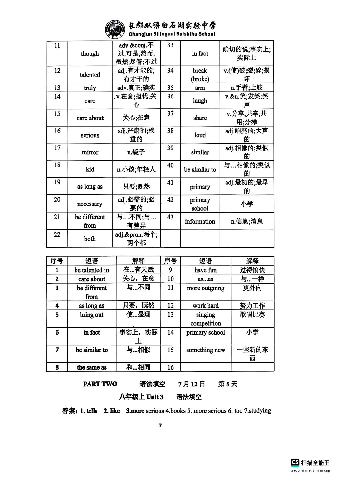 这是一份最新的长郡学校发的八升九英语资料,含有两个pdf文档,一个词汇语法练习册79页。一个词汇语法背诵手册62.页,背诵手册就是练习册的答案,上面有学校的logo,页数太多就没有去掉