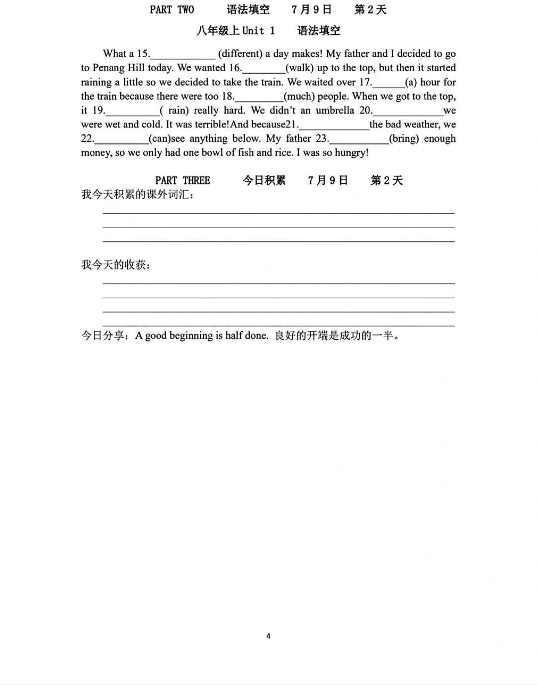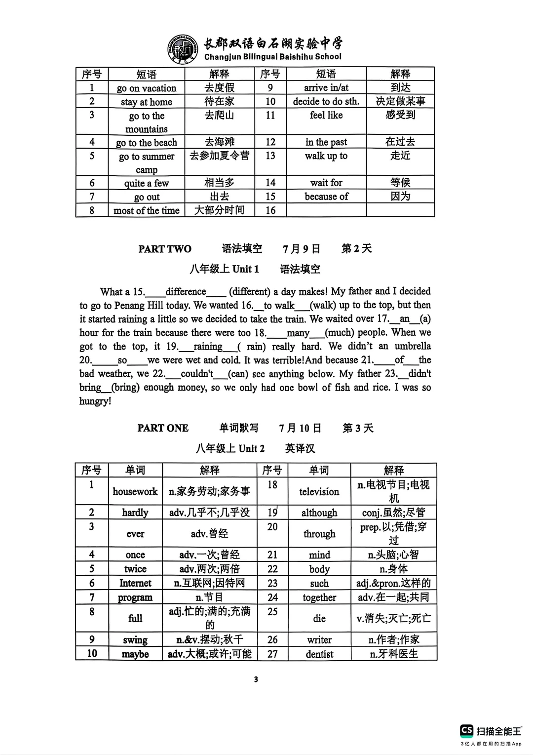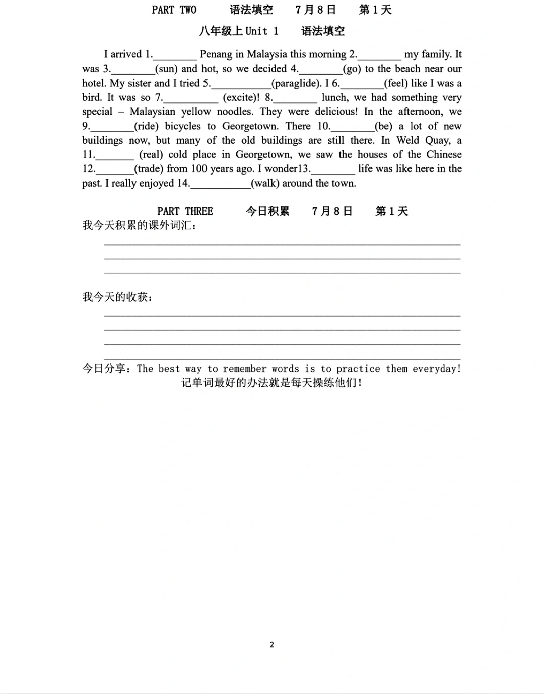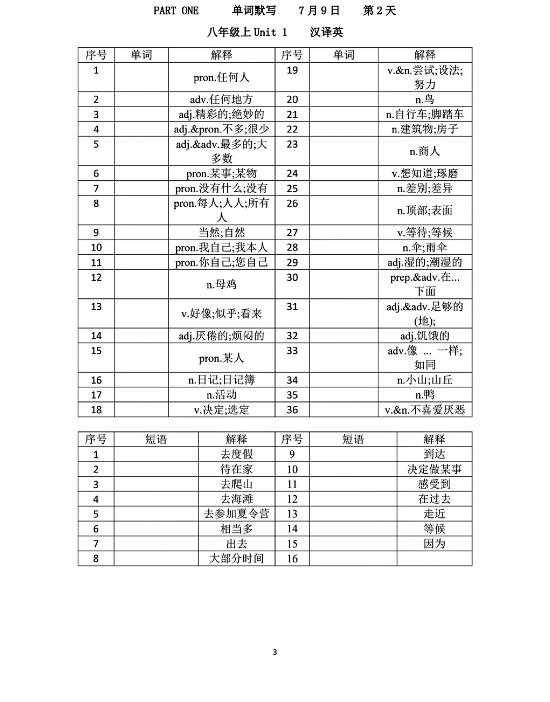 8升9八年级上下册英语语法词汇练习册