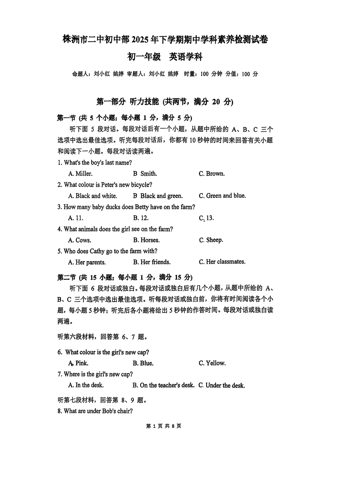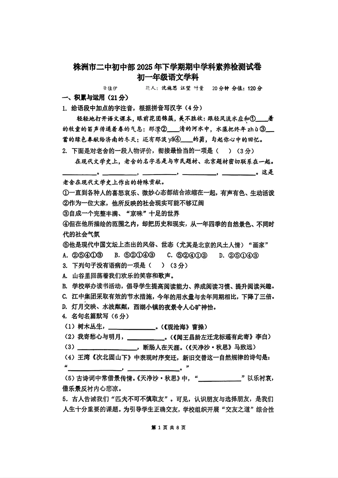 七年级上册的期中测试卷,语文数学英语各一套,共20页pdf版,没有答案, 答案可以通过ai拍照得出,这是最新收到的几套试卷,都是人教版