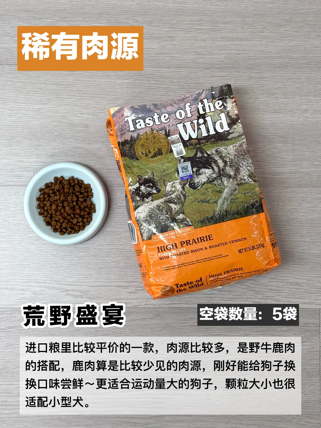 进口粮里比较平价的一款,肉源比较多,是野牛鹿肉的搭配,鹿肉算是比较少见的肉源,刚好能给狗子换换口味尝鲜~更适合运动量大的狗子,颗粒大小也很适配小型犬。