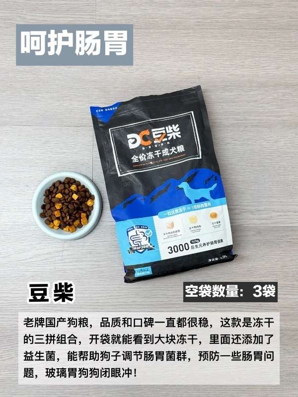 老牌国产狗粮,品质和口碑一直都很稳,这款是冻干的三拼组合,开袋就能看到大块冻干,里面还添加了益生菌,能帮助狗子调节肠胃菌群,预防一些肠胃问题,玻璃胃狗狗闭眼冲!