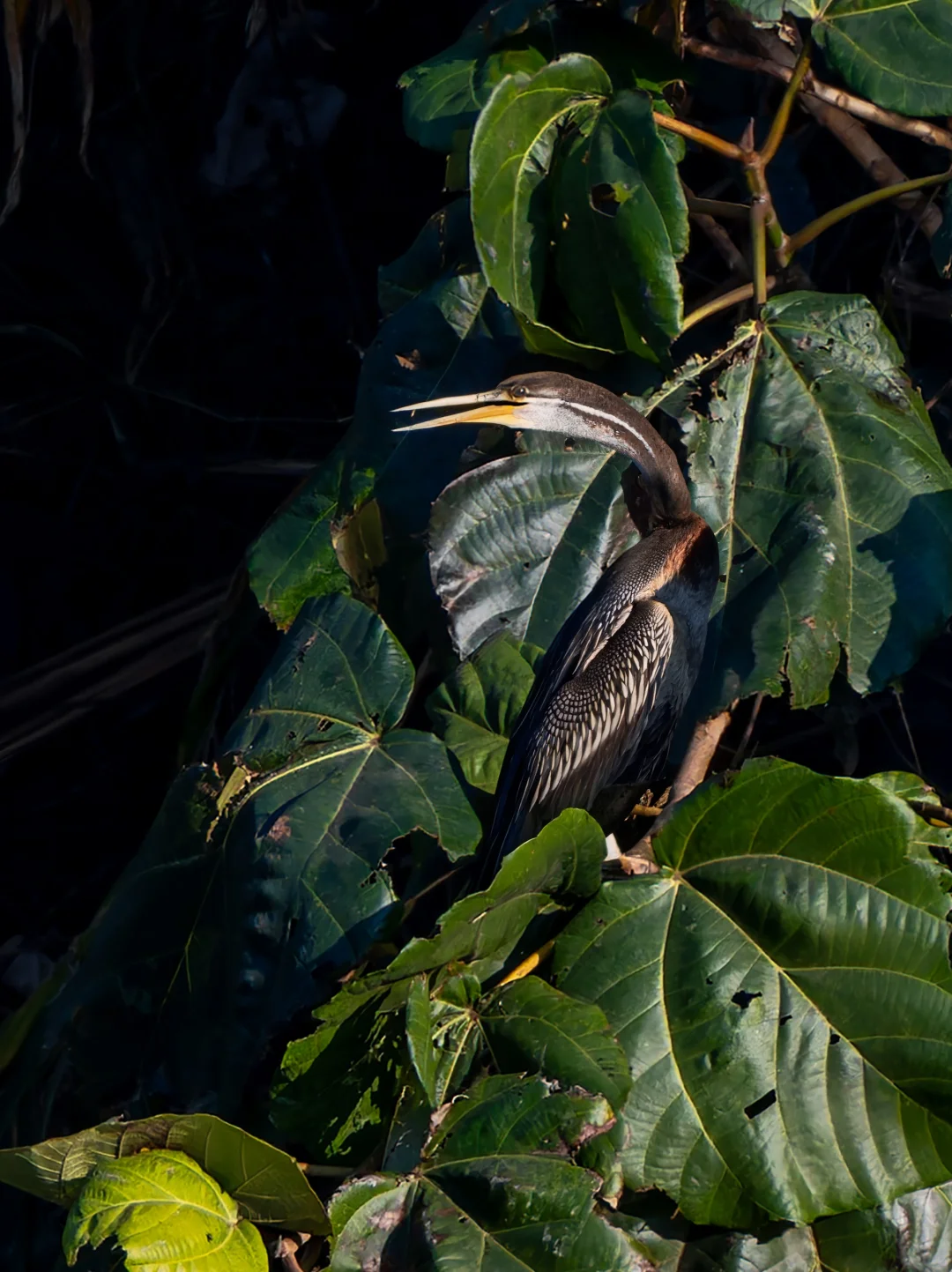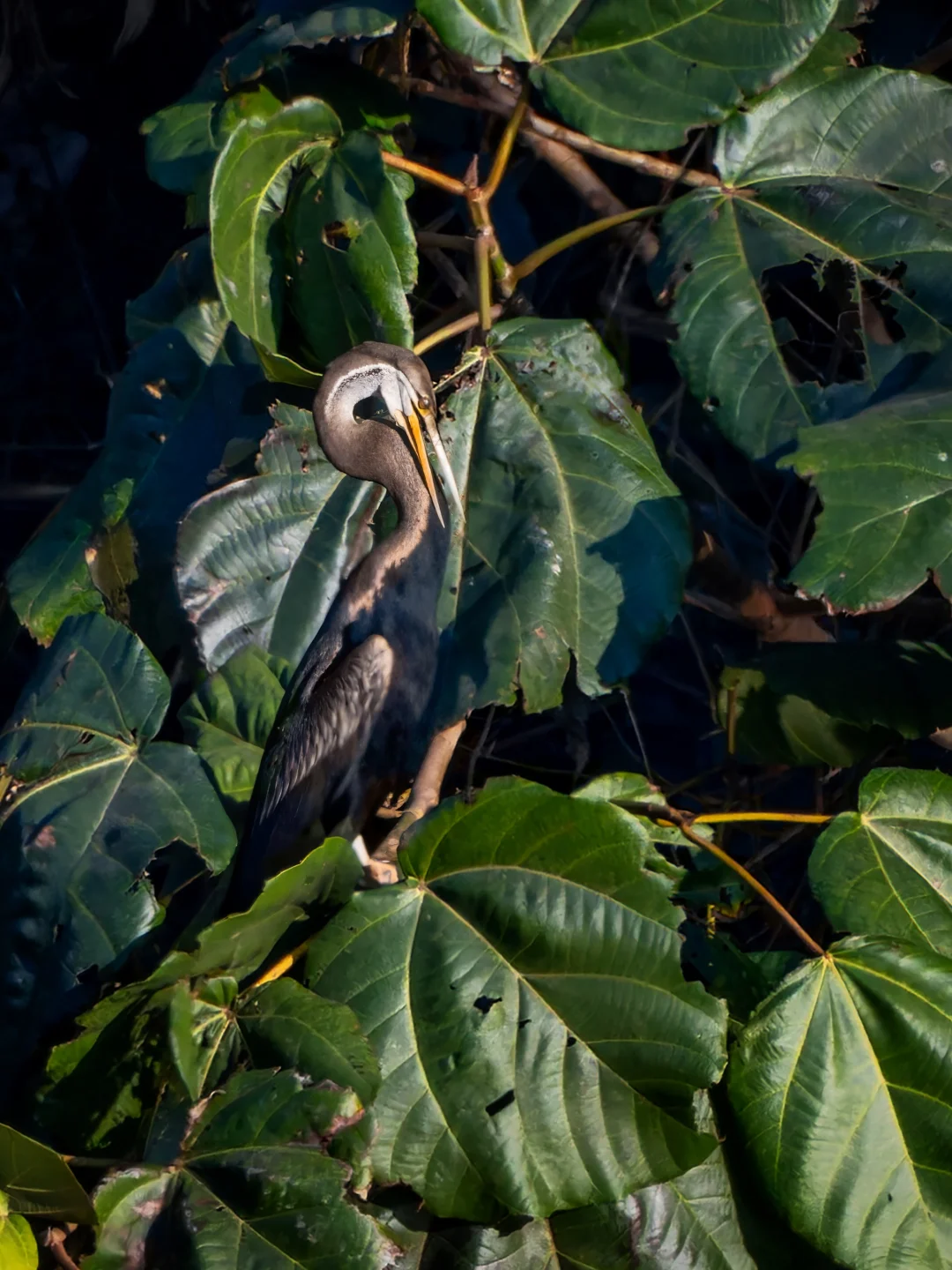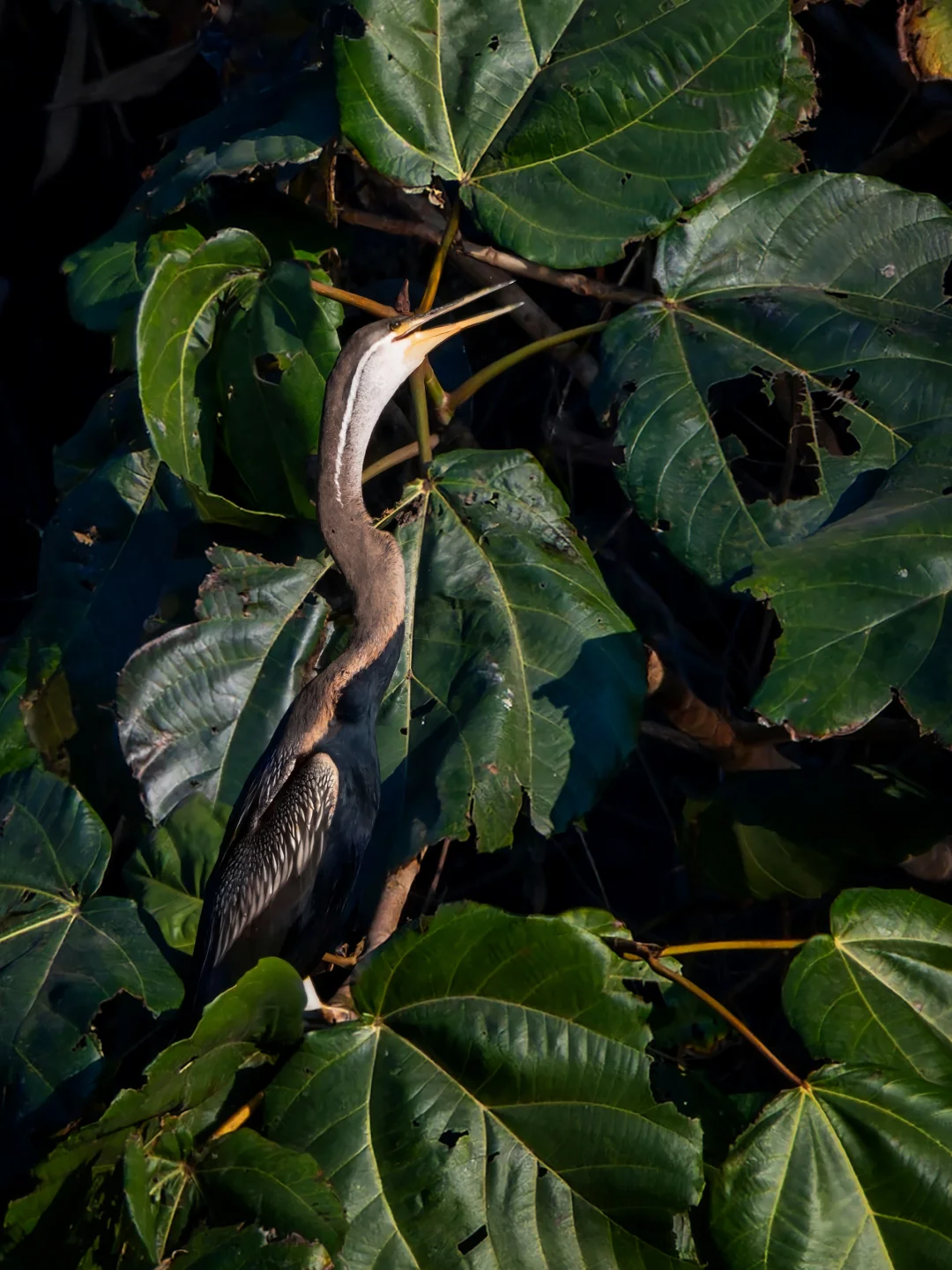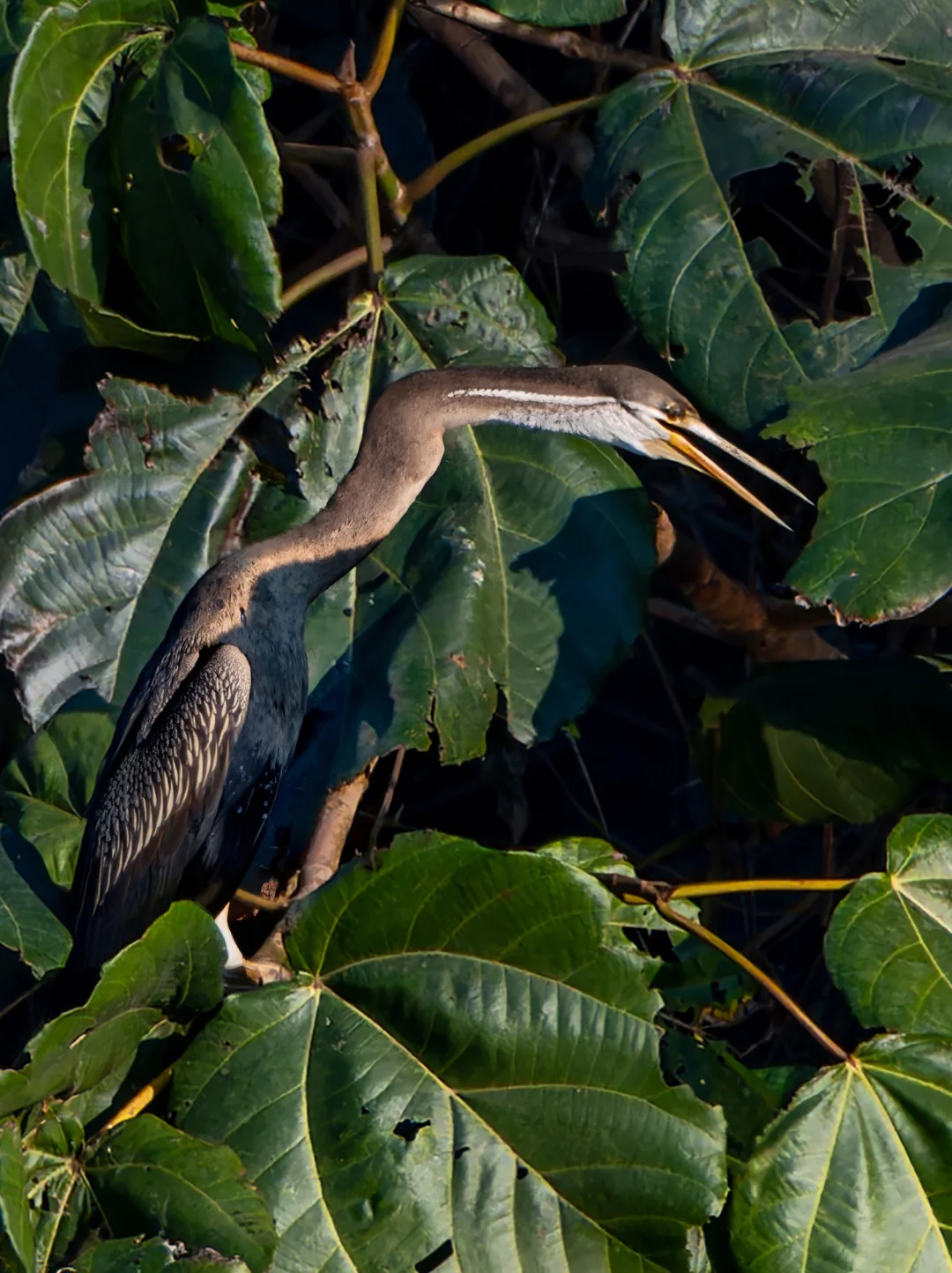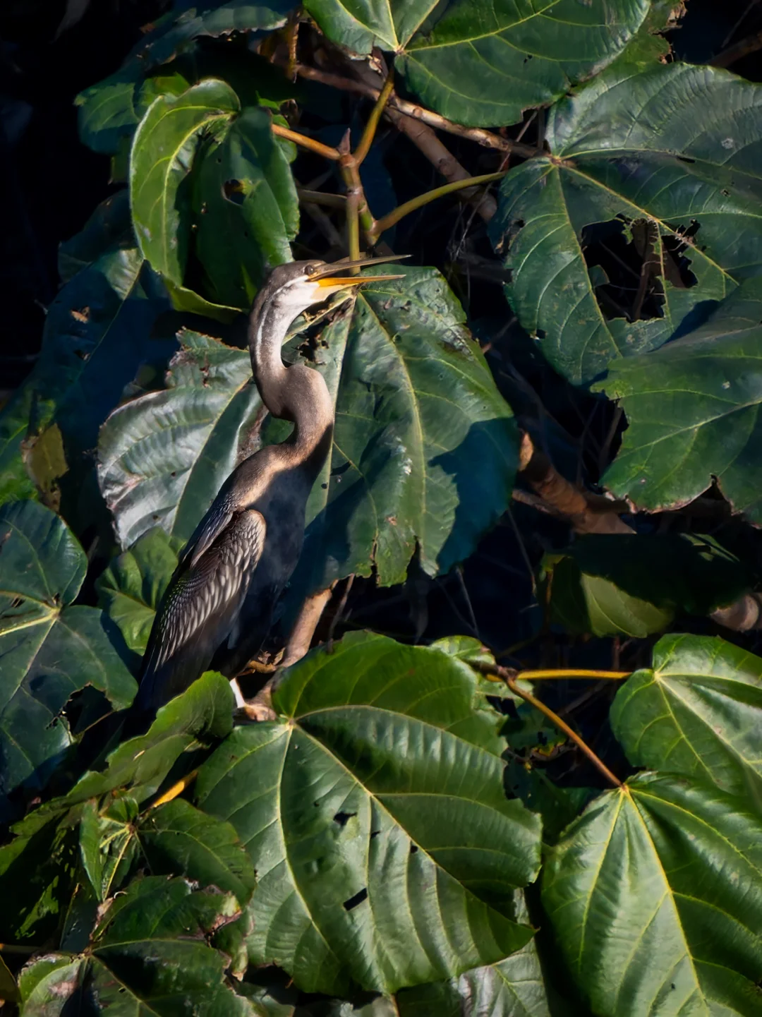 原创拍摄于2026.02 黑腹蛇鹈,Oriental Darter,鲣鸟目蛇鹈科蛇鹈属。是东南亚和南亚到水鸟。在我国分布非常边缘,记录数量稀少,这次在盈江县中缅界河大盈江上,有几只黑腹蛇鹈出现,成为鸟友们追逐的对象。 黑腹蛇鹈体型比较大,头部看上去很像鸬鹚,有一个非常细长的颈部,像一条蛇,还很灵活,由此得名。那条脖子像在演“蛇精”附体,又尽显优雅。 可惜当天缅甸的渔民划船入江,蛇鹈被惊飞,只能远远拍到这几张站在树叶上,热带的感觉。