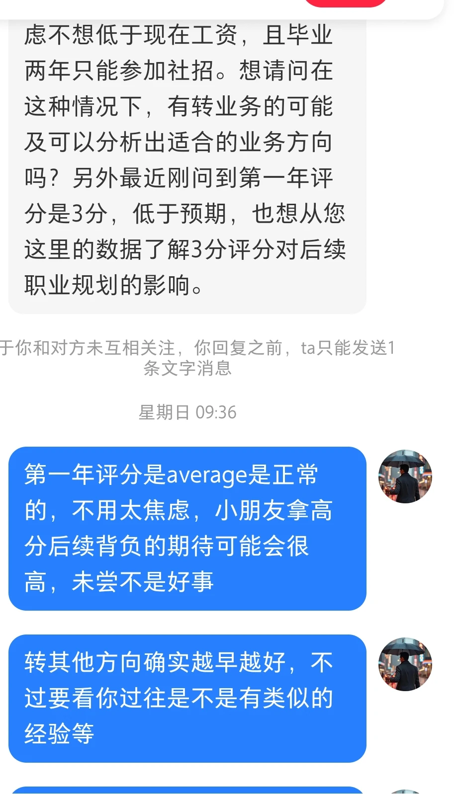 投稿原文:您好,想咨询您换行业的问题。四大fs组一年经历,但觉得四大内薪资增长慢,想转行市场营销/产品/运营等业务工作。一段行研实习、一段投行实习、一段零售商业计划实习。五院四系本商科,qs50-100量化金融。有非常严重的年龄焦虑不想低于现在工资,且毕业两年只能参加社招。想请问在这种情况下,有转业务的可能及可以分析出适合的业务方向吗?另外最近刚问到第一年评分是3分,低于预期,也想从您这里的数据了解3分评分对后续职业规划的影响。