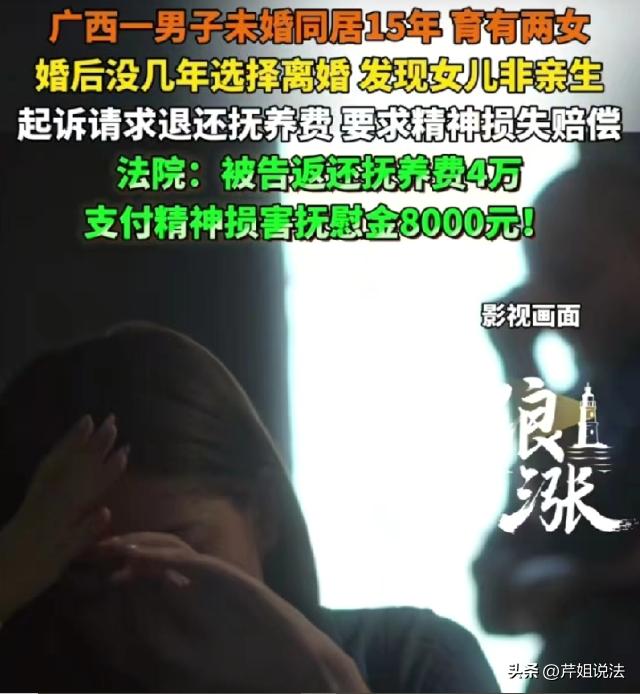 广西贵港,一男子跟女友相恋,同居期间二人感情稳定,生下了两个女儿。因为害怕被束缚,这俩人也不想去领证,后来孩子要上学、医疗,无奈只能去领取了结婚证。没过几年,两人因为感情不和又去离了婚,小女儿则判给了男子。带着孩子生活,男子发现这娃跟自己长得一点都不像。男子去做了鉴定,结果如他所料:小女儿确实不是他所生的。 得知孩子不是自己的亲生骨肉,男子非常愤怒,就把前妻给告了,要求她赔偿自己的抚养费、以及精神损失费。 浪涨新闻2月23日报道了这则新闻。 要说现在年轻人的婚恋观在于,他们认为结婚证会束缚自己的自由,所以有很多人都不去领证。 蓝先生跟杨女士,就是这样的一对情侣。 初次相遇之后,蓝某跟杨某就相识、相恋,之后感情迅速升温,二人相处起来就跟家人一样。 之后,杨某就搬进了蓝某家中居住,两个人正式开启同居生活。 因为非常信赖彼此的感情,如果真心相爱,倒也不必被一张结婚证给束缚了。所以,蓝某跟杨某二人并没有去领取结婚证。 就这样,两个人无名无分的同居了15年。 在这个15年内,两个人还先后生育了两个女儿,时间一晃,小女儿也已经10岁了。 本来害怕被一张证件给束缚,所以才没有领证。但是孩子大了,要念书了,就需要一些证件支撑。 因此,蓝某二人就去领取了结婚证。 要说男子蓝某是真心爱着自己的妻子的,可是,其实在相处期间,妻子早就外面有人了,只不过一直隐瞒着蓝某,隐秘工作做得很好。 有这样的猫腻在,即便领取了结婚证,二人也逐渐产生了矛盾,没多久之后,二人又去扯了离婚证。 离婚之后,小女儿被判给了蓝某。大女儿则跟着母亲杨某一起生活。 跟小女儿生活期间,周围邻居闲言闲语,说这个孩子,跟爸爸长得一点都不像。 当初蓝某并不想怀疑,不想质疑跟前妻的感情,也不想破坏自己跟孩子的父女之情。 但是后来他自己也察觉到,确实,这个孩子咋跟自己长得,真的很不像呢? 带着自己的怀疑,蓝某就去做了鉴定,没想到,结果确实显示,自己跟小女儿,没有父女关系。 养了十多年的闺女,现在却跟自己没有血缘关系?这让蓝某怎么可以接受呢,他们之间早就有父女感情在维系了。 然而,因为一张报告,因为妻子的不忠,如今自己的付出,全都成为了笑话。 越想越生气,蓝某准备将前妻给上诉了,要求她偿还抚养费,并且还要额外赔偿精神损失费。 相关部门是如何判定的呢? 由于前妻杨某刻意隐瞒,背叛自己丈夫的感情,跟他人生育小孩,却欺骗丈夫来抚养,不仅让蓝某的情感付出全都落空、也造成了较大的财产损失,知情权也被侵害。 最后的判定也下来了! 蓝某作为无过错方,杨某需要退还抚养费4万元,并且赔偿精神损害费8000元给到蓝某。 所以说,耗费了金钱、感情,最后却是一场空,哪个男人可以接受呢? 要说杨某的这个行为,已经构成了“欺诈性抚养”。 根据《民典法》第985条规定,没有法定抚养义务,而帮助他人抚养子女,构成不当得利,被侵权人有权要求返还。 孩子不是亲生的,就是妻子情感背叛导致。在这样的情况下,男子作为被欺骗方,有权依法主张返还抚养费、赔偿自己的精神损失费等民事权益。 而前妻一直故意隐瞒自己的丈夫,已经构成对丈夫人格权和财产权的双重侵害。 另外,蓝某面对眼前的这个“女儿”,之后是不是就要解除父女关系、自此不再联系呢? 确实,在否认亲子关系之后,就要解除监护义务。 根据《民典法》第1073条规定,一方有证据可以证明子女并非亲生,则可以向相关部门请求否认亲子关系。 蓝某确定孩子不是自己亲生的,确定没有亲子关系之后,就不需要再承担抚养义务,也可以拒绝支付孩子的抚养费。而之后,孩子对于蓝某,也不再承担赡养义务。 10多年的父女关系、自此切断,不过,这并非蓝某想要看到的,毕竟这个孩子,是他耗费了很多感情带大的。 一切,都要归咎于自己的前妻杨某,纵然当时没有领证,也不用如此放飞自我。 对此,大家都怎么看呢?