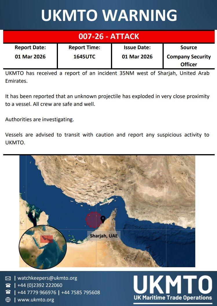 看来第三艘船也成为了袭击目标。事发地点位于阿联酋沙迦以西约40英里处,今天第三艘遇袭船只的身份,这艘船是悬挂利比里亚国旗的“海洋电光”(OCEAN ELECTRA,船号9402782),据信遭到无人机袭击(可能并非直接命中)。船上载有货物,船员安全。