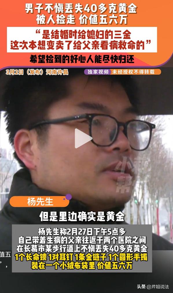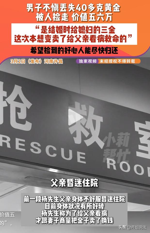 救命钱也敢拿?河南许昌,杨先生本是想把结婚的三金拿出来卖钱给父亲治病,40多克黄金五六万,停车时不小心掉在地上,被一对母子捡走。监控拍得明明白白,黄金掉下去三分钟,母子左右看一圈,捡起来就走。最后,杨先生找回丢失的黄金了吗? 在许昌的一家停车场,杨先生带昏迷父亲看病,忙了一整天,人都已经累懵了。 停车后扶父亲下车,手从口袋抽出来,装黄金的红布袋掉到地上,他没看见,一心顾着父亲。 十几分钟后他回车拿药,摸口袋空了,才知道黄金丢了。 杨先生发现黄金丢了,着急得要命。他围着停车场翻,车头车尾、路边草里全找一遍,什么都没找到。 这黄金是他结婚时给媳妇的三金,平时都舍不得动。 父亲突然病重住院,钱花光了,才拿出来准备变卖救命。他急得直跺脚,自己打自己脸,怪自己粗心,怕耽误父亲治病。 媳妇知道后没骂他,两人蹲在地上不说话,眼睛都红了。 杨先生无奈报了警,民警立马调查监控。 画面里,黄金掉地上三分钟,一对母子走过来,孩子指地上袋子,母亲停下,左右看没人,弯腰捡起塞包里,拉着孩子快步走,全程没找失主,没报警。 五六万对普通人家是笔不少的数目,对杨先生家更是救命钱。父亲躺医院昏迷,每天医药费压得全家喘不过气,就指望这点三金换钱。 现在被人捡走不还,一家人彻底慌了。杨先生说,只要还回来,怎么都行,只求对方看在救父亲的份上,把东西还了。 这事传到网上,网友都气。 有人说捡救命钱太缺德,有人说看监控就是故意占为己有。 大家气的不是丢东西,是有人拿别人活路填自己贪心。 捡东西该找失主或交给警察,这是规矩。 更重要的是,捡了不还,不是道德问题,是违法。 很多人以为捡来就是自己的,错得离谱。 法律讲的清楚,不是你的就不能拿,拿了不还,要担责任。 《民法典》第三百一十四条:拾得遗失物,应当返还权利人。拾得人应当及时通知权利人领取,或者送交公安等有关部门。 第三百一十五条:有关部门收到遗失物,知道权利人的,应当及时通知其领取;不知道的,应当及时发布招领公告。 第三百一十六条:拾得人在遗失物送交有关部门前,有关部门在遗失物被领取前,应当妥善保管遗失物。因故意或者重大过失致使遗失物毁损、灭失的,应当承担民事责任。 捡到别人丢的东西,必须还给人家。要么联系失主,要么交给警察。 捡到之后要好好放着,别弄坏弄丢,弄坏弄丢要赔钱。就是一句话:捡到就得还,不还就是违法,失主可以起诉要回来。 《刑法》第二百七十条:将代为保管的他人财物非法占为己有,数额较大,拒不退还的,处二年以下有期徒刑、拘役或者罚金;数额巨大或者有其他严重情节的,处二年以上五年以下有期徒刑,并处罚金。将他人的遗忘物或者埋藏物非法占为己有,数额较大,拒不交出的,依照前款的规定处罚。 把别人丢的东西占为己有,数额大还拒不交出,就是侵占罪。数额大多地方一万以上就算,杨先生这黄金五六万,远超标准。 真闹到法院,拒不还的,可能判两年以下有期徒刑、拘役或者罚金;数额巨大的,还能判两到五年,并处罚金。 本次事件中,40 多克黄金价值五六万元,已达 “数额较大” 标准。 如果捡拾的母子经警方通知或失主讨要后,仍拒不归还黄金,将涉嫌侵占罪,不仅要承担返还财物的民事责任,还将面临相应的刑事处罚。 杨先生这事,就是普通人家遇到难事的真实样子。上有老人生病,下要顾着家,拿三金换救命钱,已经走投无路。 捡走黄金的母子,可能当时一时贪念,没往心里去。但希望你们看见,这不是普通钱,是人家父亲的命。 主动还回来,什么事没有;硬不还,民警找上门、法院传票到手里,后悔都来不及。 也给所有人提个醒:出门带贵重物品,放好、盯紧。捡到别人东西,别贪,还回去是本分,不还是违法。别因为一时贪心,毁了自己,也毁了别人一家。 你们说这对母子会主动把钱还回来吗?