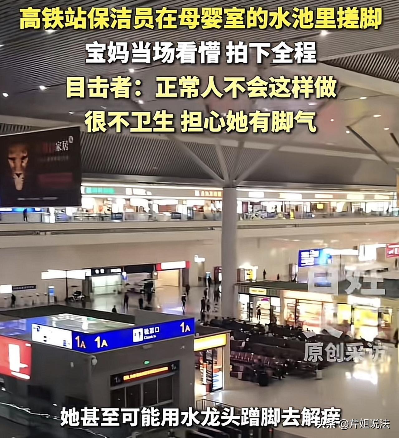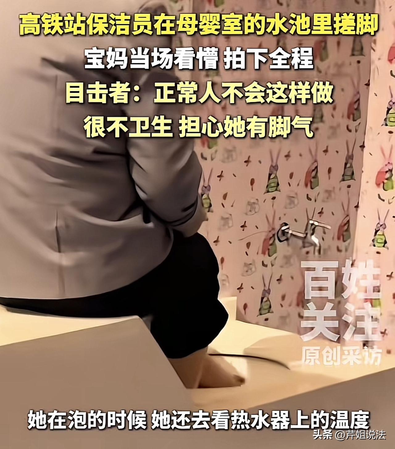 河南郑州,一宝妈在高铁站母婴室喂完奶休息,竟撞见保洁员推门进来,就这么当着她的面用给宝宝洗屁屁的专用水池泡脚! 事情发生在2026年2月28日,事发地在郑州东站二楼的母婴室里。 当天,这位宝妈在母婴室中刚给宝宝喂完奶,抱着孩子打算在母婴室里休息一会。 由于母婴室本就是为宝妈和小宝宝设置的爱心场所,私密又干净,所以宝妈也并没有防备着周遭环境,很放心地就让小宝宝这摸摸那闻闻的。 可就在这时,只听“哐当”一声,门被推开了。 一个保洁阿姨走了进来,只见她抬眼扫了一眼一旁的宝妈和小宝宝,抬腿就走到了水池旁边。 而接下来的一幕,直接让宝妈呆立当场。 只见这位保洁阿姨二话不说,一屁股就坐到了一旁较高的水池上。 随后只见她熟能生巧地几下拽掉鞋袜,一脚就伸进了旁边较低的儿童专用水池中,随后更是打开水龙头自顾自地就泡起了脚。 宝妈登时脑海里就炸起了一道惊雷。 她怎么也想不到,本该维护公共场所卫生的保洁员,竟然会做出这样的事情! 要知道,这个水池可是专门给小宝宝洗手洗屁屁的地方,现在却被人用来泡脚,这要是脚上再有什么不干净的东西……宝妈简直都不敢再想下去。 退一步说,这要是她不在场也就罢了,可明明她和宝宝都就在现场看着,这个保洁阿姨却仍旧没有丝毫收敛,就好像她用母婴室的洗手池泡脚是什么天经地义的事情似的! “本来想算了的,但是当妈的是真的忍不了!” 宝妈越想越气,当场就拍下视频发到网上。 在配文里她是这样说的,保洁阿姨就算工作再辛苦,再想注意个人卫生,也不该占用母婴室的专用水池泡脚吧?这不是个人私事,而是关乎到所有使用这个母婴室的宝宝的健康的事情! 视频一发出来,瞬间便在网上掀起一波热潮。 全网都在盯着这件事的后续,而涉事保洁阿姨所属的物业公司,也当晚就发布了致歉声明。 声明里,物业先为管理不到位、给旅客造成不适进行了深刻的道歉。 紧接着,他们又公布了处理结果。 辞退保洁阿姨,同时更换该区域的全部母婴设施,并进行深度消杀整改! 除此之外,物业还承诺,会全面完善保洁员的管理机制,针对保洁员的服务标准、职业道德开展专项整顿,从制度、流程、人员管理入手,全方面堵住漏洞,杜绝此类事件再次发生。 根据《公共场所卫生管理条例》第六条明文规定,经营单位应当负责所经营的公共场所的卫生管理,建立卫生责任制度,对本单位的从业人员进生卫生知识的培训和考核工作。 换句话说,这次事情并不仅仅是保洁阿姨一个人的问题,其背后的物业公司也有不可推卸的责任,因为他们没有按照法律规定对保洁阿姨进行应有的卫生知识的培训和考核。 而眼看事情到了这里,看似已经有了一个结果,可网上的讨论,却还远远没有停止。 有同样是宝妈的网友直呼太可怕,说之前带宝宝进母婴室都是很放心的,现在一看真的是心里都泛起一阵后怕!这要是宝宝摸到什么病菌然后又吃进了嘴里,都不敢想象会发生些什么! 也有网友愤慨出声,说这种人骨子里就是坏,必须严惩!培训出这样员工的公司也有很大问题,连基本的卫生知识都不培训好就放出来,简直就是在祸害人! 但也有网友提出了不同的看法,表示也不能都怪物业公司,实在是现在很多地方的保洁都是外包,工资低,很少有人愿意干这些又累又没钱可拿的脏活累活,所以也就很难保证员工的素养问题。 对于这件事,您有什么看法?欢迎留言讨论。 来源:大风新闻、百姓关注