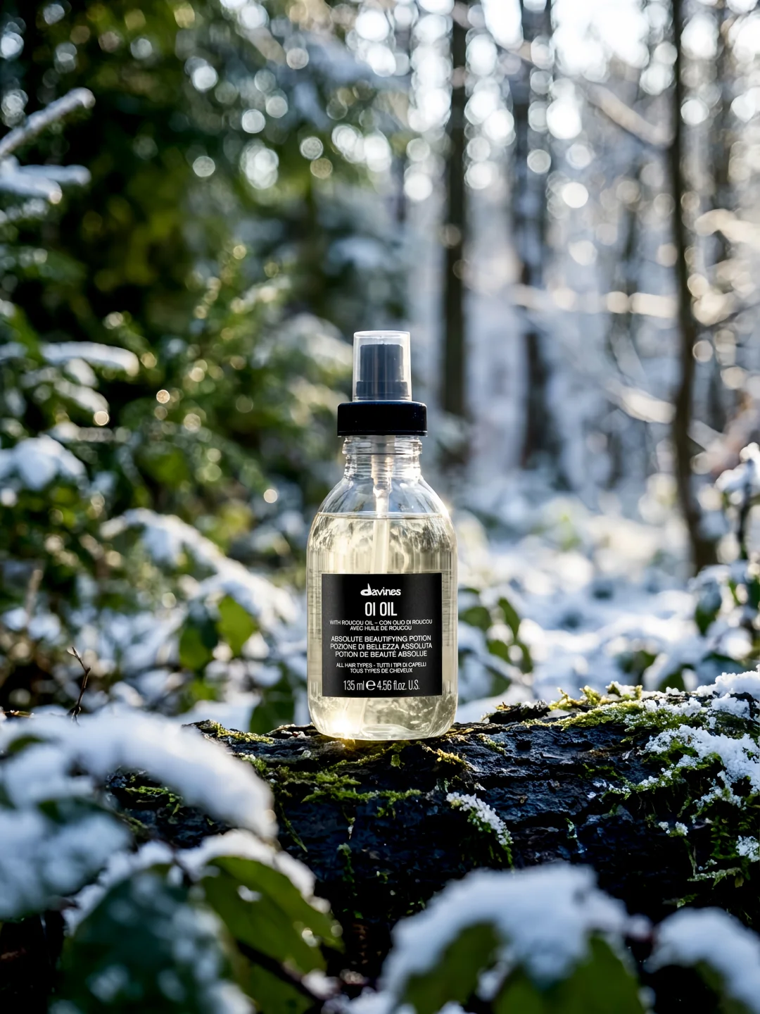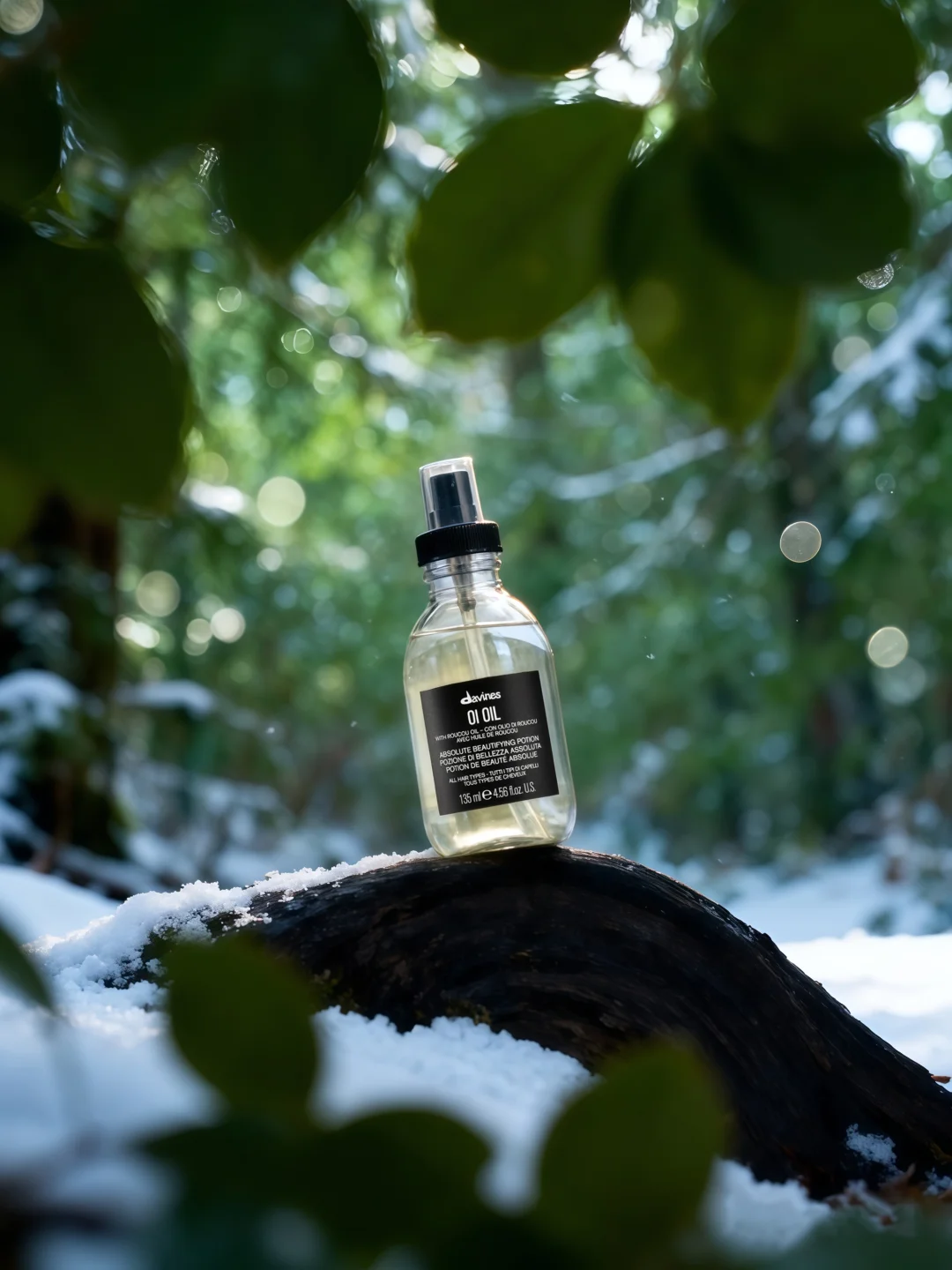 像雪落在松针上那样轻盈,一推即开,吹发前使用,抵御热风伤害,也可在造型后点涂发尾,瞬间带出细腻光泽和线条感,像刚从冷冽森林里走出,发梢带着被阳光照亮的微光