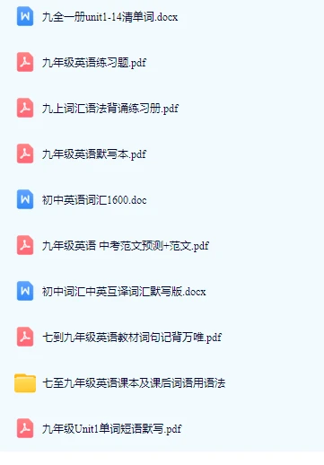 近几天收到的一份八升九英语预习资料,长郡学校的,共36页pdf,前21页是默写,后面是答案,第二张图里资料一起发,收到的一些九年级英语复习资料,中考复习资料