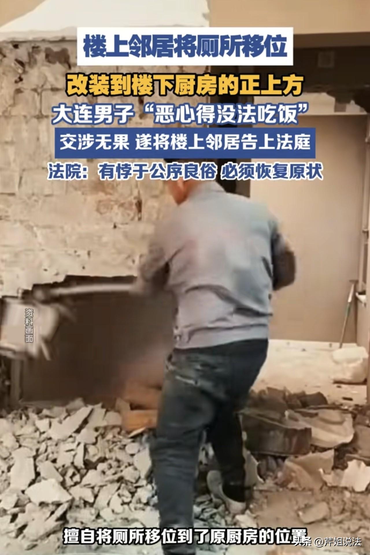 拉屎拉到头上了!辽宁大连,周某楼上的邻居柳某重新装修,竟然将卫生间改到了周某厨房的正上方!这下周某的日子开始变得苦不堪言起来,每到吃饭的时候,他就想起自己的头顶上是上厕所的地方,或许这个时候柳某就在上厕所,周某立马觉得自己碗里的饭,桌上的菜都变了味道,于是他只能窝 囊地端上饭碗回自己的卧室吃。周某向柳某提出将房子恢复原状的要求,可花费大价钱改造房子的柳某又怎么肯呢?最终他只能将柳某告了。 3年前,周某在厨房吃饭的时候,偶然发现厨房的天花板湿漉漉的,周某认为这是楼上邻居柳某家里发生了渗透。 于是周某果断上楼去拜访了柳某,好让柳某及时把家里渗水的地方检修好,否则受累的就是他。 敲开30多年老邻居的大门,周某先客套地称赞了一句:“翻新得真好看,自己到时候有空了也翻修一下,跟住了新房一样。” 然后才委婉地向柳某表明自家天花板渗水了,想来你家看看。 这一看就不得了,以前周某知道楼上乒乒乓乓地是在翻新,可他不知道柳某竟然翻新了房屋的结构,他竟然将卫生间改到了厨房的位置。 周某心下一沉,这么一改,自己家做饭,吃饭的时候不都在他厕所下面进行了吗?这还让人怎么吃饭? 当时的周某虽然有些不高兴,但还不想和柳某撕破脸皮,只是好声好气地告诉柳某记得把厕所检修一下。 可他回到家里后,日子却开始变得没滋没味起来,他觉得膈应,自己在柳某的厕所下面吃饭,如果这个时候柳某在上面上厕所,这和“拉屎拉到头上”有什么区别? 而且现在还发生了渗漏,万一这渗漏的水滴到了自己的饭里菜里,那得有多脏啊?周某越想越觉得恶心,他开始把饭菜端到自己卧室吃。 可卧室又怎么是吃饭的地方?一不小心就把油污弄到床单上了,清理得很是麻烦,有时候吃一点味大的,睡觉的时候整个房间里都还是那股味儿,这让周某怎么睡好觉? 周某越来越气,打心底里觉得自己和柳某楼上楼下当了30多年的好邻居,柳某这翻新整得太不地道了。 于是周某又上楼敲开柳某的大门,这下态度没那么好了,他语气生硬明显就是对柳某不满,他直截了当地就提出了要柳某把房子恢复原状的要求。 柳某这一听不乐意了,开什么玩笑? 自己花了大价钱翻新,住着正舒心,怎么他叫恢复原状就恢复原状。 柳某觉得周某简直就是在无理取闹!他生气地拒绝了周某的要求。 周某却坚持自己的要求,被拒绝后几次上楼沟通,他说柳某这是擅自改变房屋结构,擅自将厕所改到自家厨房上面,对自己的生活产生了严重的影响,柳某必须负责! 而且现在厕所已经发生了渗水,谁知道以后会不会发现什么危险事故?万一就让整栋楼塌了呢? 可无论周某再怎么说,柳某就是不答应,两人话不投机,最后一拍两散。 柳某在周某身后狠狠关上了门,还骂周某没事找事。 回到家的周某觉得既然自己多次劝说要求他都不听,那他就把柳某告了,看他改不改! 法院受理这起案件后,展开了积极行动,他们委托了专业机构到柳某和周某的家里做现场勘察。 经鉴定确认,柳某的卫生间没有渗漏,那周某天花板上和墙上的水痕又是怎么来的呢? 鉴定机构先确定了周某家确实有水痕,有渗漏痕迹。 他们说柳某翻新不但改动了厨房和厕所的位置,还对主下水管做了轻微的改动,这就导致可能有支管漏水渗到周某的家里。 在这样的事实下,一审在今年的2月25日做出了判决,支持周某的诉求,判决柳某在60日内将卫生间恢复至原设计位置。 这下,被拉屎拉到头顶的周某可算是扬眉吐气了,过段时间他就可以在厨房里安安心心吃饭了,不用再有所膈应了。 《民法典》第288条规定相邻权利人应本着有利生产、方便生活、团结互助、公平合理的原则处理相邻关系。 周某和柳某是上下邻居,因为柳某的改动,周某产生了膈应的心理,严重影响了自己的生活,家里也发生了漏水情况,他的权利受到了柳某的侵害。 柳某的翻新是让两家的关系变得紧张,让周某受到了不公平的待遇,他没有按照规定的原则去处理相邻关系。 周某的诉求是合理合规,应受到支持的。 《住宅设计规范》(GB50096-2011)第5.4.4条规定卫生间不应直接布置在下层住户的卧室、起居室(厅)、厨房和餐厅的上层。 需要注意的是,该规定由住房和城乡建设部发布,是强制性的规定。 因此柳某翻新时候改动厕所的位置,将厕所的位置布置在下层住户周某的上层是不合规的,柳某的卫生间必须恢复到原本的位置。 类似这样的案例还有很多,最终都无一例外被判定恢复原本的位置。 来源:红星新闻 海报新闻