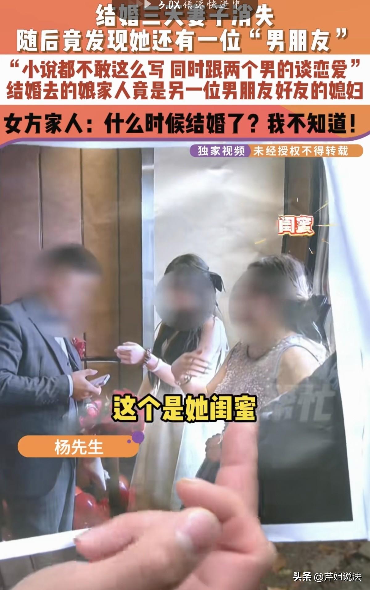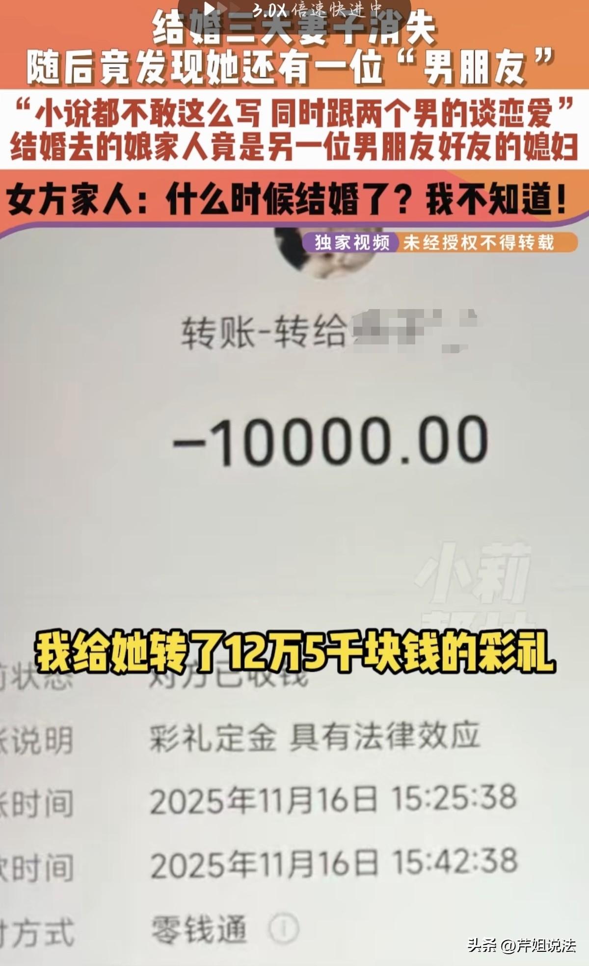 河南,一男子在与女友结婚三天后,新娘竟然不见了踪影。经过男子的一番查找发现,自己的新娘居然还有一位男朋友!女子的丈夫和男朋友见面对了对时间,发现该女子在与其中一名男子结婚时,其实跟另一位男子刚刚分手一个月。而该女子的家人表示,从来不知道她结婚的消息,甚至已经两年没有联系上她了。 你相信一见钟情吗?这样句话听起来像俗套的浪漫爱情故事中,形容男女主的第一次相遇。但在现实的杨先生,是真真感受到了一见钟情的滋味。 据杨先生回忆,2023年是他与自己刚结婚的妻子第一次相识,没有小说里炫酷的相遇方式,只是在一家普普通通的理发店内,简简单单的对话,杨先生便觉得自己遇到了自己生命中真正的那个人。 就这样,杨先生开始茶不思饭不想,每天想着一个又一个的借口,偷偷在女子的身边停留。庆幸的是,这个女子好像也察觉到了杨先生的心意,也开始慢慢回应起来。 经过杨先生一段时间的追求,女子终于答应了杨先生的请求。那一刻,杨先生觉得自己这次真是被幸运女神所眷顾,甚至跟朋友聚餐都忍不住的向好友炫耀自己的女朋友。 经过两年的磨合,2025年,杨先生决定不忍了,当杨先生结结巴巴的对女子求婚时,女子只是轻轻笑了笑,便答应了杨先生。 这个时候的杨先生早已被爱情冲昏头脑,那几天杨先生连走路都是轻飘飘的,到哪都是乐呵呵的。好友们知道后,也恭喜杨先生终于苦尽甘来,抱得美人归了。 不过就像小说中男女主总要经历一些磨难一样,女子等杨先生回来后,哭丧着告诉他,自己的家里人不同意女子与杨先生结婚。 这下可把杨先生急坏了,连忙追问原因,女子支支吾吾说不清只说,家里人没看上杨先生。 这下可好,杨先生的脚步又开始沉重起来了,眼看着自己马上就能跟心爱的女子结婚了,偏偏对方的家里人就是不同意他们在一起。 一天的思考,杨先生决定先带些东西去看看女方的家人,只要自己好好表现,肯定能用诚意打动他们。 杨先生回到家,刚要把自己的想法说给女友,怎料,还没等杨先生开口,女友直接扑到杨先生的怀里,说:我家里面的人,就是不同意我们结婚,但是我跟定你了,我这辈子就非你不嫁,我们先不要领证,直接结婚吧。到时候,生米煮成熟饭也不怕他们不同意了。 杨先生一听,顿时被女友感动到了,当场许诺一定要办最盛大的婚礼风风光光的迎娶女友。 杨先生说到做到,婚礼当天,新娘新郎盛装出席,新郎还摆了好几桌请了不少亲戚朋友作见证。 但据新娘介绍,自己的家里人却只来了自己的闺蜜和自己的姐姐。 杨先生觉得这样的事得慢慢来,更何况两个人都结婚了,生米煮成熟饭就算是女方家想反悔也来不及了。 虽然,新娘家里来的人并不多,但杨先生还是好好招待了她们,并且当天就给新娘转了12万5千块的彩礼。 正当杨先生觉得自己的生活一定会越来越好时,三天后新娘便不见了踪影。 起因是杨先生想着,两个人都结婚了彩礼也一分不少的给了,现在就差领证,她家里人就算是再不同意,该见还是得见一见。 本以为女子很快就会同意的杨先生,当即就向女子提出了这件事,正当杨先生想着该带些什么去见家长时,妻子却一反常态的跟他吵了起来。 杨先生是又委屈又不理解,自己只不过是想见见自己妻子的家人,再怎么说这也是为她着想啊,怎么她反而跟自己发起脾气了? 两个人发生争执后,女子直接把杨先生拉黑并离开了他们目前的小家。 过了好多天,杨先生都联系不上妻子着急的杨先生马上在网上发布了寻人启事。 但是,让杨先生怎么也没想到的是,找回来的不是自己心心念念的妻子,而是一个自称妻子男朋友的陌生男人。 这个陌生的男人,告诉杨先生,自己姓孟,他在网上看见杨先生寻人启事上的照片发现对方找的,正是才刚跟自己分手一个月、自己怎么联系也联系不到的女朋友。 这下,杨先生懵了,刚跟自己结婚三天的妻子居然是有男朋友的!这个消息震的杨先生半天都没缓过神来。 随着调解员的到来,杨先生和孟先生大致对了对,发现其实这个女子只是个到处骗人的骗子。 在杨先生婚礼上的女方姐姐及闺蜜其实是孟先生朋友的妻子和女儿,在杨先生跟女子谈恋爱的时候,女子也在与孟先生谈婚论嫁。 孟先生对调解员说,“我是真心想跟她过日子来的,我把所有的工资都给了她,连小说也不敢这样写啊。” 调解员了解情况后,经过一番周折终于联系到了女子的父亲。 女子的父亲对调解员的话更是一头雾水,他跟调解员沟通时说:她什么时候结了婚?我什么都不知道啊,她已经快两年没有回过家了,我现在也一直联系不上她。 根据《刑法》第二百六十六条规定,该女子及其相关人员涉嫌诈骗犯罪,目前此案件还在调查中。 本以为是遇见了自己的真命天女,结果却是个四处行骗的时间管理大师,杨先生真是赔了夫人又折兵。 对此你有什么看法?欢迎评论区留言。 信息来源:小莉帮忙