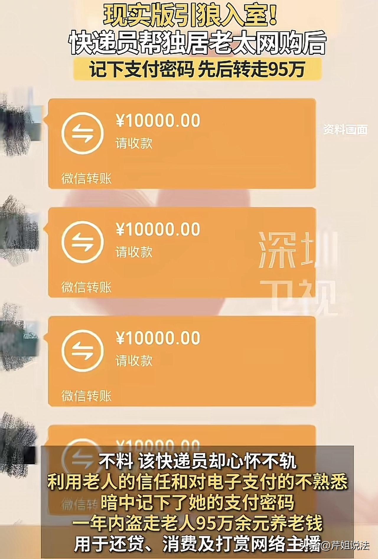 上海,一80多岁独居老人,短短一年竟被“干儿子”偷走95万养老钱!更离谱的是,在老人说要报警后,他竟还更加猖狂! 姜老太太年过八旬,子女不在身边,平日里孤身一人,连个搭把手的人都没有。 而在这个时候,送快递的石某出现了,石某仗着嘴甜,然后时不时还帮老人搬个东西跑个腿,时间一长姜老太太竟从石某的身上感到了几分家人的味道。 就这样,老太太不仅经常塞给他零钱、零食和生活用品,甚至还主动提出要认石某做干儿子。 甚至,老太太怕石某没地方住,还跟主动和石某说自己手里有两套房子,想着让石某日后可以搬来一起住,两个人住得近,彼此都好有个照应什么的。 然而老人的好心落在石某的眼里却沦为了可以随意拿捏的软柿子! 在一次送货的过程中,姜老太太想在网上买个茶几,可研究半天愣是没搞明白该怎么下单。 没想太多,老太太转头便请一旁送货石某帮忙操作操作。 老太太打心底相信石某,对其并无防备,支付密码轻易便告诉了石某。 而反观石某,脸上不露声色,暗地里却早已把算盘打得噼啪作响。 没过几天,石某便再次上门,趁着帮老人操作手机的间隙,偷偷用老人的微信给自己转了1毛钱。 转账成功! 当转账成功的页面出现在自己眼前的时候,石某欣喜若狂,心里的贪念再也控制不住! 账户到账,1500元! 石某当场就用同样的方式,又转走了1500元! 第一次作案后,一开始石某还整天提心吊胆,生怕被老人发现。 可几次上门,老太太不仅依旧热情,还一个劲地夸他人好。 看着老人这副毫无察觉的模样,石某的胆子也是愈发的大了起来。 他就算准了老人年纪大了,对手机余额数字不敏感,平时还一个人在家里,身边没人提醒。 就这样,之后每当自己缺钱的时候,石某就借着上门帮忙的机会给自己偷偷转账。 一千!两千! 一万!两万! 随着偷转的金额越来越大,石某也越发的肆无忌惮起来。 这样的偷窃,持续了一年多。 直到2025年9月,姜老太太突然发现,自己工资卡里的钱少了一大截。 她慌忙地给石某打去电话,说怀疑自己被骗了,已经报了警。 可笑的是,直到这个时候,姜老太太都还完全信任着石某。 可石某却做贼心虚,慌慌张张地就上了门。 拿过老人的手机,石某颤抖着将自己微信里仅剩的6000多元全都又偷偷转回给了老人。 而姜老太太看着钱转了回来,居然就真的没再深究下去。 然而侥幸逃过一劫的石某不仅没有丝毫悔意,甚至还更加变本加厉! 在有一次姜老太太打电话请石某上门帮她操作手机上网买菜的时候,石某在操作时一眼就看到了银行卡上的余额。 二三十万! 里面居然还有二三十万! 想到自己手头又紧了,石某仅存的那一点点良知彻底消失。 再次转账,这次甚至比之前那几次都还更加疯狂! 2025年11月,石某以帮老太太调整网速为借口上门,随后趁着老人不注意,短短两天时间,竟丧心病狂地先后转走9万多元! 直到案发,警方一查才知道石某在短短一年多的时间里,居然先后从姜老太太的账户里窃取了95万元有余! 这些钱全都被他挥霍一空,有用来还高利贷的,有给女主播打赏的,还有很多他个人的高消费的。 根据《刑法》第264条规,盗窃公私财物,数额特别巨大或者有其他特别严重情节的,处十年以上有期徒刑或者无期徒刑,并处罚金或者没收财产。 石某盗窃金额高达95万,已经属于数额特别巨大的了,所以不仅牢狱之灾不可避免还得面临着高额罚金甚至直接就是没收所有财产! 而在这件事曝光之后,网友们也都纷纷为老太太打抱不平。 有网友气得不行,说石某自作孽不可活,连人与人之间最基本的信任都没有,真是把老太太的心都伤透了 也有网友感慨,现在很多独居老人真的是太缺陪伴了,这才给这些别有用心的人可乘之机,子女真该多上上心,不能把光钱丢给老人就什么都不管了! 那么对于这件事,您有什么看法?欢迎留言交流。 来源:杭州日报、深圳卫视