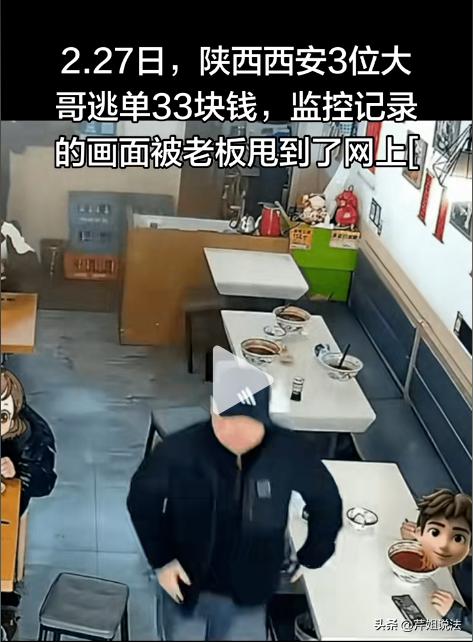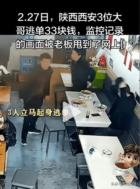 西安,一家面馆,三个大男人,点了33块钱的面,趁老板不注意,10秒钟假装没事人似的,集体逃单。这也太好笑了,消费330逃单可以理解,消费33也逃单,这就有点不可思议了。再说了,三个成年男人,每个人兜里会没有10块钱? 这究竟是恶意逃单,还是另有隐情? 一家夫妻小面馆,来了三名男子吃面,三碗面共计 33块,人均消费 11 快。吃完后三人没有主动结账,而是坐在桌前假装闲聊,全程都盯着老板的动向。 一名男子正面望风,其余两人则用余光盯着门口,不掏手机、不喊老板,就等逃单的机会。 不久,老板转身向后厨走去的瞬间,三人立刻起身,推门、迈步、快步离开,整个过程不到 10 秒,三人就消失在监控里。 老板从后厨出来,第一眼就看到了三人坐过的桌子,桌上还放着三个空碗,汤汁洒了一点在桌上,却不见一个人影。 原以为他们是出去买东西或是忘了结账,但是等了十几分钟,不管是门口还是面馆附近,都没有出现这三个男子的身影,桌上的空碗还摆在那里,没有任何人回来结账。 老板这才着急起来,意识到自己可能被逃单了。他赶紧放下手里的活,快步走到收银台,调开店里的监控,一遍一遍地回放,看完监控后,老板瞬间就气炸了 西安这家小面馆是夫妻店,老板起早贪黑守着小本生意,一碗面挣的都是辛苦钱。老板要凌晨四点起床揉面、熬汤,一碗面扣掉房租、水电、食材成本,纯利润也就 3 到 5 快。 33块钱,对普通人来说,可能随手就花出去了,根本不会放在心上,但对这家小面馆来说,却不是一笔小数目。 33 块钱的损失,意味着他要多煮十多碗面,多忙活大半天才能补上。 更让老板寒心的是,开店这些年,遇到过不少手头拮据的顾客,只要对方开口说一句有困难,他从来都是直接免单。 西北人做生意,讲究的就是一份底层互助的人情味,老板自己也经历过低谷,知道每个人都会遇到难处,所以能帮一把就帮一把,从来不会为难别人。 可这三个人,宁愿费尽心机逃单,也不愿说一句实话。 面馆老板气不过,直接把监控发到网上,不是为了博流量,只是想给同行提个醒,也希望这三人能主动回来补钱。 这三个大男人能密切配合、伺机逃单,说明脑子不笨,手脚不懒,可偏偏为了 33 块钱,明晃晃地逃单。 如果真是兜里钱不够,可以直接跟老板说明,哪怕赊账也比逃单强吧 。 说到底,他们不是穷到拿不出 33 块钱,而是把 “面子” 看得比诚信重,把 “占便宜” 当成了小聪明,觉得求助丢人,逃单却能 “占便宜不被抓”。 在现实生活中,太多小商店、小店铺遇到过这种逃单事。 小吃店、小面馆,逃单金额少,报警后调查要时间、费精力,追责的成本比丢的钱还多,最后大多只能自认倒霉。 也正因为这样,一些人才有恃无恐,觉得逃个几十块钱,就算被发现也没什么事,反正没人较真。 这事之后,难免会有很多小店的老板产生顾虑,下次遇到说没钱、有困难的顾客,还该不该帮? 帮了,怕遇到这种假困难、真占便宜的人,自己的辛苦钱打了水漂,善意被利用;不帮,又怕错过真需要帮助的人。 当然,逃单从来都不是 “小事”,更不是 “没人管”。 《治安管理处罚法》第二十六条明确规定,强拿硬要公私财物的,处五日以上十日以下拘留,可以并处五百元以下罚款;情节较重的,处十日以上十五日以下拘留,可以并处一千元以下罚款。 吃霸王餐、恶意逃单,本质上就是强拿硬要公私财物,哪怕只有 33 块钱,也已经触犯了这条法规。 目前警方已经介入调查,店主也保留了完整的监控证据,这三人不仅要补回 33 块钱的饭钱,还可能面临拘留和罚款,为自己的算计付出实实在在的代价。 如果经查实有多次逃单行为,金额累积起来,还可能涉嫌刑事犯罪,到时候后悔都来不及。 你觉得当下该如何降低小额逃单的概率,既守住小微商户的利益,又不凉了普通人的善意?