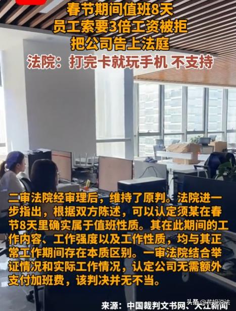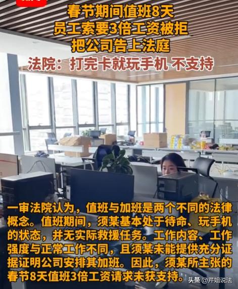 江苏,一男子春节留守公司值班8天,本想着能拿3倍工资,结果收假后老板死活不发,说男子只是待命没实际维修,不算加班。这样算下来的损失就有6240元,男子多次索要无果,直接起诉了公司,可法院最终的判决却引发了不小的热议! 今年马年春节,须某没回去和家人团圆,不是不想回,是岗位实在特殊。 他在一家销售公司做机电维修工,公司里的机器,全靠他盯着。 从大年初一到初八,整整8天,一天都没落下。 他早就算好了,春节法定假日,3倍工资,这8天下来,能多赚不少。 这8天公司的机器也格外给力,从头到尾没出一点故障,没需要他修一次。 没事干,他也不敢走远,就怕机器突然出问题,这种待命的滋味,真的不好受,比干活还累。 收假之后,须某最期待的就是发工资,就等那笔3倍加班费到账。 可工资条发下来,他当时就懵了,这8天不白守了? 他去找人事,想问清楚到底是怎么回事,人事的态度很冷淡,一句话就把他打发了。 说他这8天,就是单纯待命,没实际干维修的活,不算加班,自然没有加班费。 须某当场就急了,机器没坏我修什么?我一直守在这里,随时准备维修,这不是工作吗? 可人事说这是公司的规定,后来他又找了老板,老板的说法和人事一模一样。 还说他小题大做,没干活还想要加班费,纯属无理取闹。 这8天的罪白受了,连句辛苦都没有,更别说加班费。 须某不甘心,多次找公司协商,可每次都被拒绝,觉得自己没做错,凭什么拿不到加班费。 索性一不做二不休,直接起诉了公司,就是想讨个公道。 他认为自己按时打卡,坚守岗位,应该输不了,毕竟春节值班拿3倍工资,这是大家都知道的事,怎么到他这就不算了? 须某把自己8天的打卡记录都提交了,还有自己在公司待命的照片。 他反复强调,自己虽然没修机器,但一直处于待命状态,随时准备工作。 公司那边却不认可,说安排他值班,只是为了应对突发情况。 他没实际提供劳动,工作强度和正常上班完全不一样,不能算加班。 这段时间,职场维权的话题频频上热搜,很多打工人都在关注这件事。 大家都觉得须某应该拿到加班费,毕竟他一直守在公司。 可法院的判决结果,让所有人都意外了。 判决结果出来之前,须某还觉得自己稳赢,可拿到判决书的那一刻,他彻底懵了,法院驳回了他的全部诉求。 这一下,网上们也议论纷纷,有人替须某抱不平。 那么,值班和加班到底怎么分?待命不算加班吗?须某真的拿不到加班费吗? 其实这个问题,很多打工人都遇到过,尤其是节假日值班,很容易和公司起纠纷。 据《劳动法》第44条,里面明确规定,法定休假日安排劳动者工作的,支付不低于工资的百分之三百的工资报酬。 这里的关键的是“工作”,不是“待命”。 也就是说,想要拿3倍工资,必须是在法定假日实际提供了劳动。 据《最高法关于审理劳动争议案件适用法律问题的解释》第42条,劳动者主张加班费的,应当就加班事实的存在承担举证责任。 须某虽然提交了打卡记录,但他无法证明自己在这8天里,实际提供了维修劳动。 法院认定,值班和加班是两回事,加班是正常工作的延续,需要持续提供劳动,和平时工作强度一样。 值班则是临时性的看守、应急保障,工作强度明显降低,员工可以适当休息,不需要持续劳动。 须某这8天,只是待命,没实际修机器,工作内容和正常上班完全不同,工作强度也低很多,所以不能认定为加班。 可有人觉得,待命也是工作,也牺牲了个人时间。 但法律上的认定,就是看是否实际提供劳动。 还有一点,公司安排须某值班,是为了保障机器正常运行,应对突发情况,不属于安排他加班完成经营性工作。 所以,从法律层面来说,法院驳回须某的诉求,是符合法律规定的,并不是偏袒公司。 这起案件的关键争议就是:值班和加班的界定,很多打工人都混淆了这两个概念,最后维权失败。 须某之所以没赢,就是因为他没搞清楚两者的区别,也没保留实际工作的证据。 这起案件也给所有打工人提了个醒,节假日值班,一定要问清楚公司,是值班还是加班,待遇怎么算,最好留下书面记录。 要是实际提供了劳动,一定要保留好工作证据,如工作记录、聊天记录,避免后续维权无门。 还有,现在很多公司都玩文字游戏,把加班说成值班,就是为了不付加班费,打工人一定要擦亮眼睛,别被坑了。 法院一审驳回了须某的诉求,须某不服,提起了上。 二审法院审理后,维持了原判。 也就是说,须某最终还是没拿到那8天的3倍加班费。 看到这个结果,心里还是有点挺不是滋味的,须某牺牲了春节团圆的时间,守了8天公司,最后却一无所获。 但法律就是法律,讲究的是证据和事实,不能凭情绪判断。 你们觉得,须某真的不该拿这3倍工资吗?如果是你,遇到这种情况,会选择忍气吞声还是起诉维权? 你认为像春节这种法定节日,只要付出了时间给公司,是否就应该拿到平时工资的三倍呢?