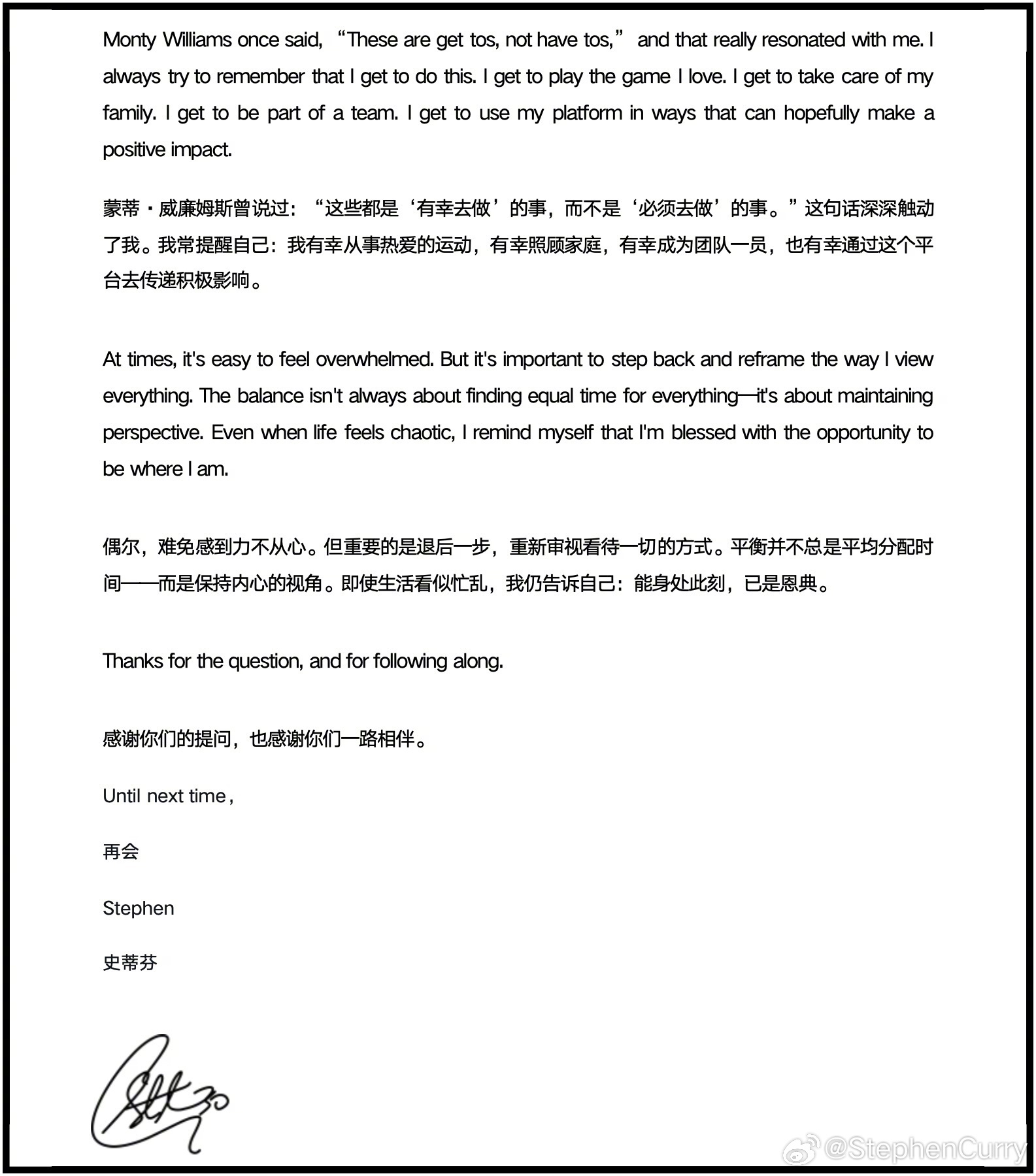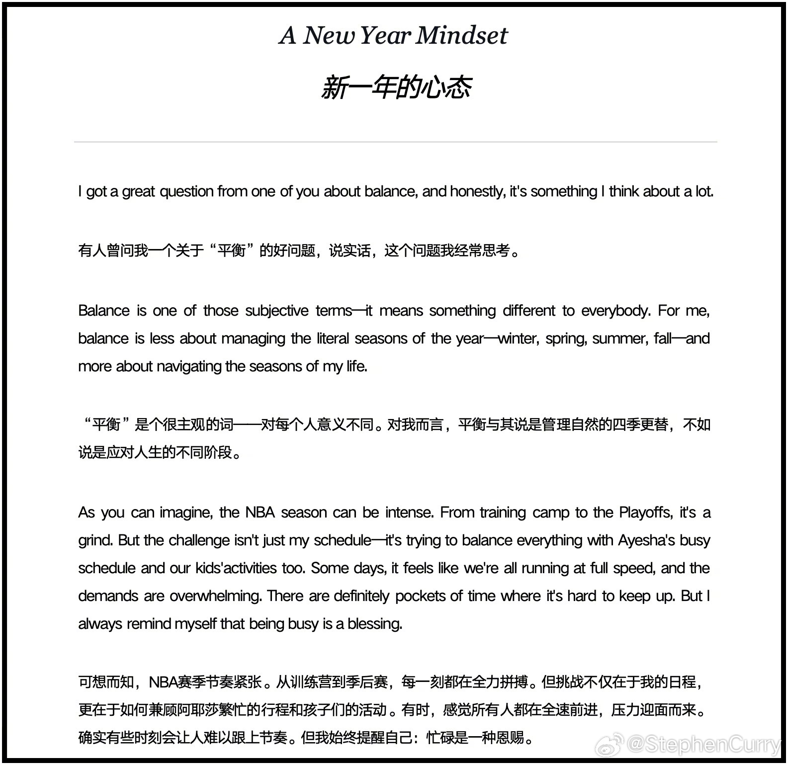 #库里分享感悟#【#库里发文谈家庭与生活心态#】3月5日,库里发文分享关于家庭、平衡与生活视角的感悟。