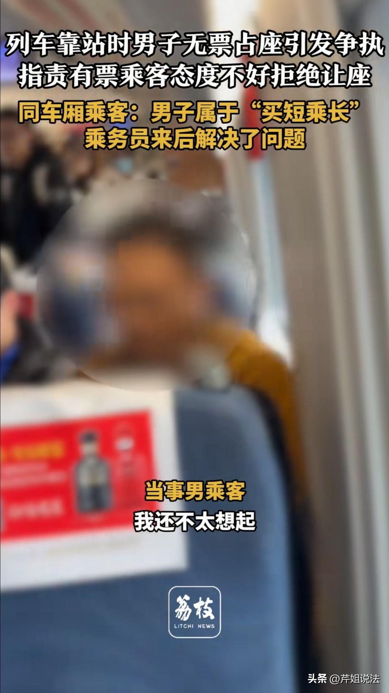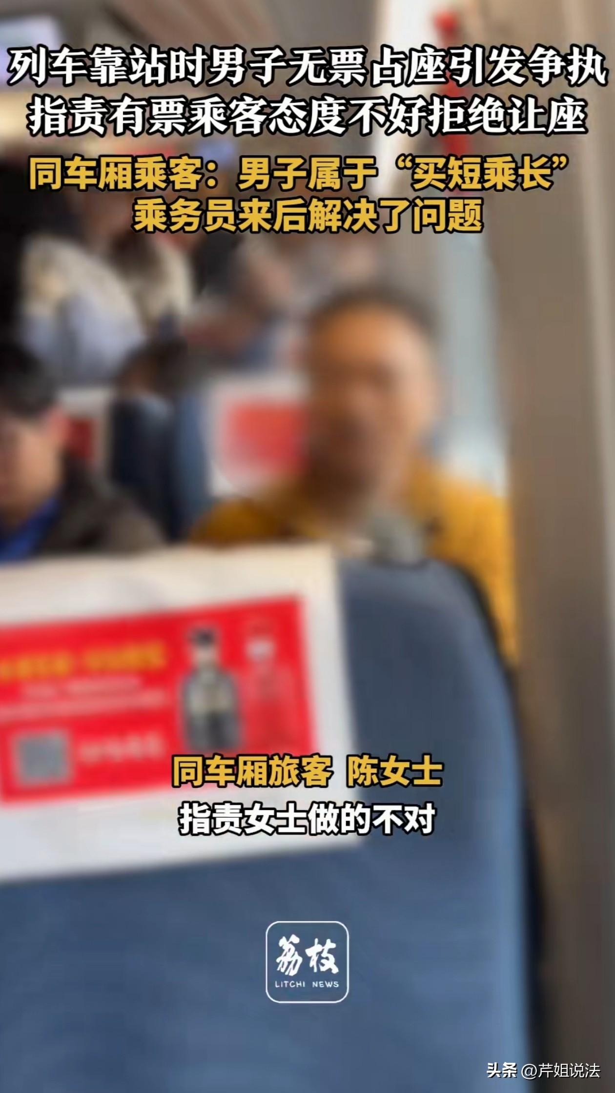 有两名乘客在高铁上发生争吵的视频被曝光流出,起因是一男子买了无座票,不但占用空座,而且还是“买短乘长”的。随后,有该座车票的女乘客上车了,发现座位被占后,就请求该男子让座。但男子因觉得对方讲话态度不好,表示不想起开了,后又反客为主,以“说教”的语气开始指责女子。随后,两人展开争执,经乘务员调解后,男子不情愿起身离开了。真是乌鸦站在猪身上,只看见别人黑,看不见自己黑! 据悉,3月1日,该男乘客买的是从金华到诸暨的无座票,上车后发现有空座,就暂时先坐下了。 后有该车票座位的女乘客上车了,但发现自己的座位坐着别人,就喊到“这是我的座位,请你让一下”。 原本只要这名男子起身离开,再表示一下抱歉,这事就算过去了,但可能是因为女子的声音太过洪亮,其语气引起了男子的不满,男子表示“我也没说不给你坐,你走过来,我就给你坐,你那么老远叫什么。” 显然,此时男子已经开始把矛盾的焦点由自己的“无理占座”转移到了女子对自己的“态度”问题上,并且还带着一副自己很有理的“说教”语气。 紧接着有其他乘客表示,“你们吵能不能稍微靠边?”,因为女子还未入座,男子还未起身,导致女子挡在了过道中间,影响了其他乘客行走。 万万没想到,男子竟这个机会“乘胜追击”,又当面摆了女子一道,“对呀,能不能让后面先过”,不得不说这招太妙了,男子这轻飘飘的一句算是成功“拉拢”了其他乘客,将矛盾的焦点全部转移到了女子身上。 这样的结果就是很容易让周边一些不知情的乘客,觉得该女子态度太恶劣,还挡着过道,没素质。 如果周边人都跟着起哄,而女子要是意志不坚定的话,就会很容易陷入自我怀疑中,俗称“被PUA了”。 果不其然,一旁真的有乘客在不知其事情缘由的情况下,仅凭双方的语气态度和几句交谈,就站在男子这边为其打抱不平。 好在女子思路清晰,意志坚定,没有跳进男子的陷阱里。不过这也彻底惹毛女子了,女子生气喊道,“那你起来了,我就进去了啊”。 男子也是拗起来了,“我本来想起的,但你这样叫我,我就真不想起了”。 女子当即呼叫乘警,但过来的是乘务员,乘务员来了之后,男子竟表示要补票,这其实就是在“买短乘长”。 补完票,才不情愿的起身离开!这点真让人生气,补票就补票,还非得坐着补,这让女子一顿久等啊。 据同车的其他乘客描述,在女子来之前,该男子就在静音车厢内用手机外放声音。 这期间,前后乘客多次提醒无效,随后乘务员过来举牌表示警告提醒,但并未再做其他处理。 没想到,男子在起坐后,就站在女子一旁的过道里,在静音车厢外,继续外放手机声音,疑似表示不满。这才是真的态度有问题,自己一身毛,还说别人是妖怪! 有网友说,乘务员就一点事情不解决吗? 也有网友对其作出回应,乘务员没有执法权,但如果是乘警过来,就有权利将男子带走处置。 没错,乘务员主要负责服务、提醒、上报,并没有执法权,不能强制带离乘客,也不能罚款和拘留。而乘警负责治安、抓人和处罚,是有执法权的。 这件事虽小,却折射出很多公共空间值得反思的现象。 霸座、买短乘长、在静音车厢吵闹、扰乱公共秩序都是违规行为,是需要引以为戒的。 同时要注意,女子有票但座位被霸占,本就是受害者。而男子非但不让座,反而通过PUA、挑拨同行乘客等方式转移矛盾,倒打一耙,这种恶人先告状的行为就是缺乏同理心。 文明不是空话,是我们出门在外的底线,规矩也不是摆设,而是我们出行的基石。 在享受公共空间的便利的同时,就应该承担相应的义务,而不是光想着自己舒服。 若遇上了不讲理的、不守规矩的人,要及时拍好证据,找工作人员,该维权就维权,绝不退让,这才是真的在维护大家的出行秩序。 来源:荔枝新闻