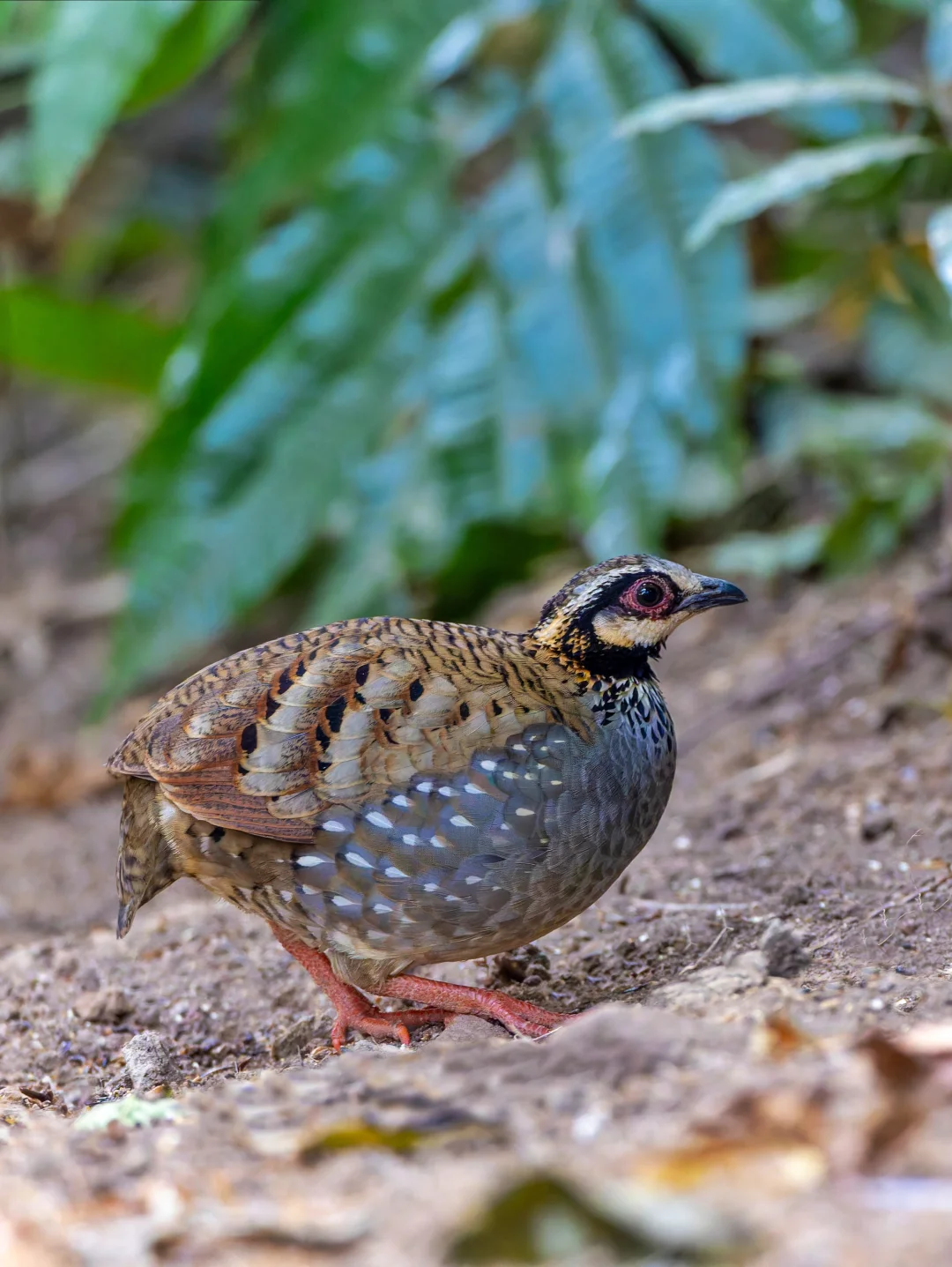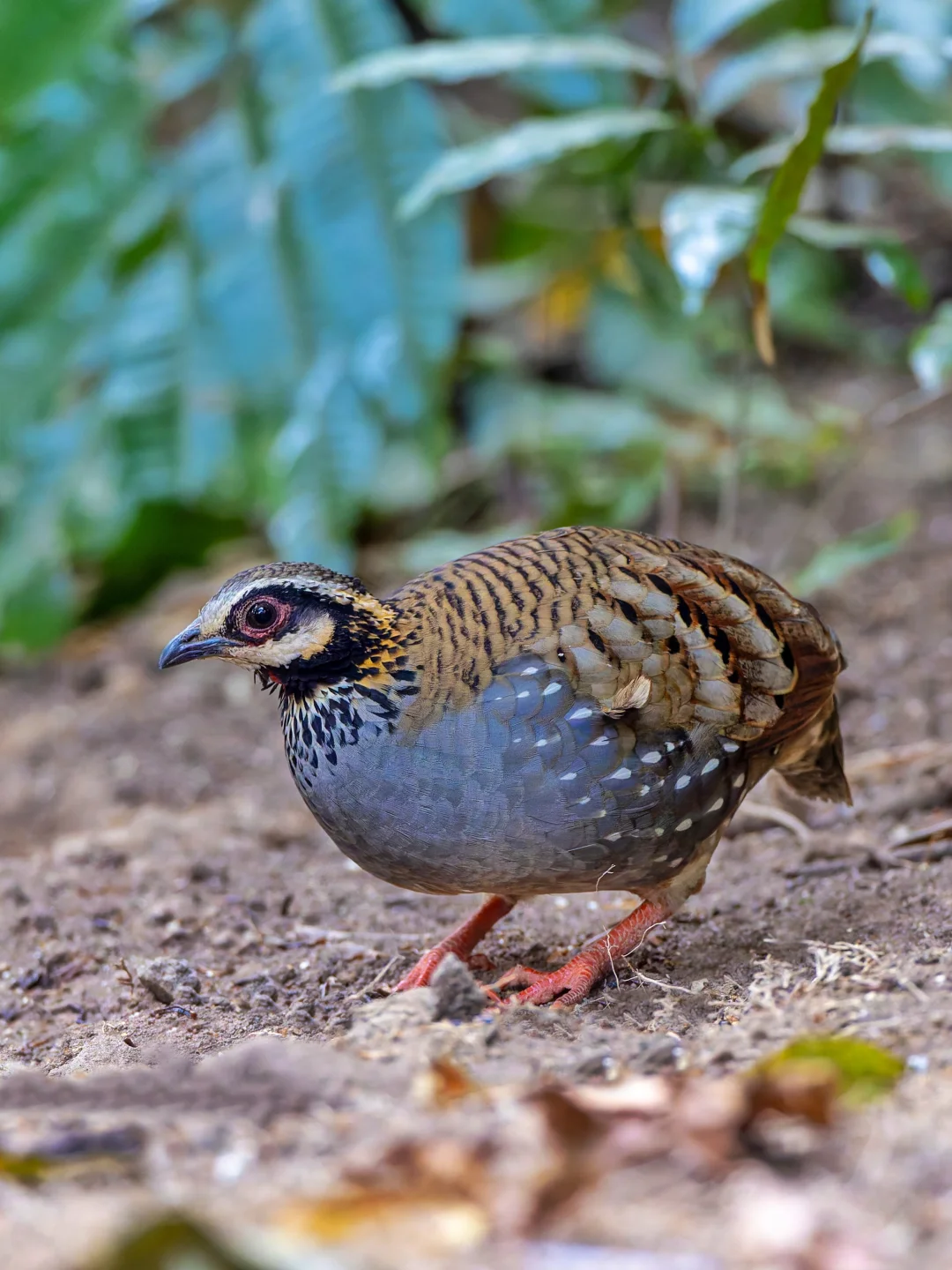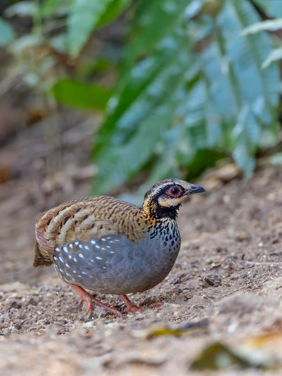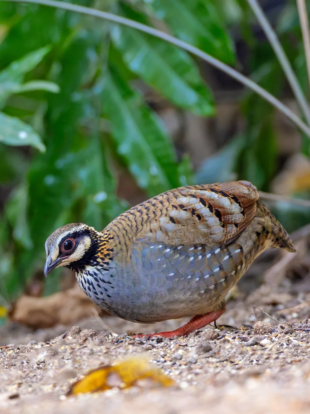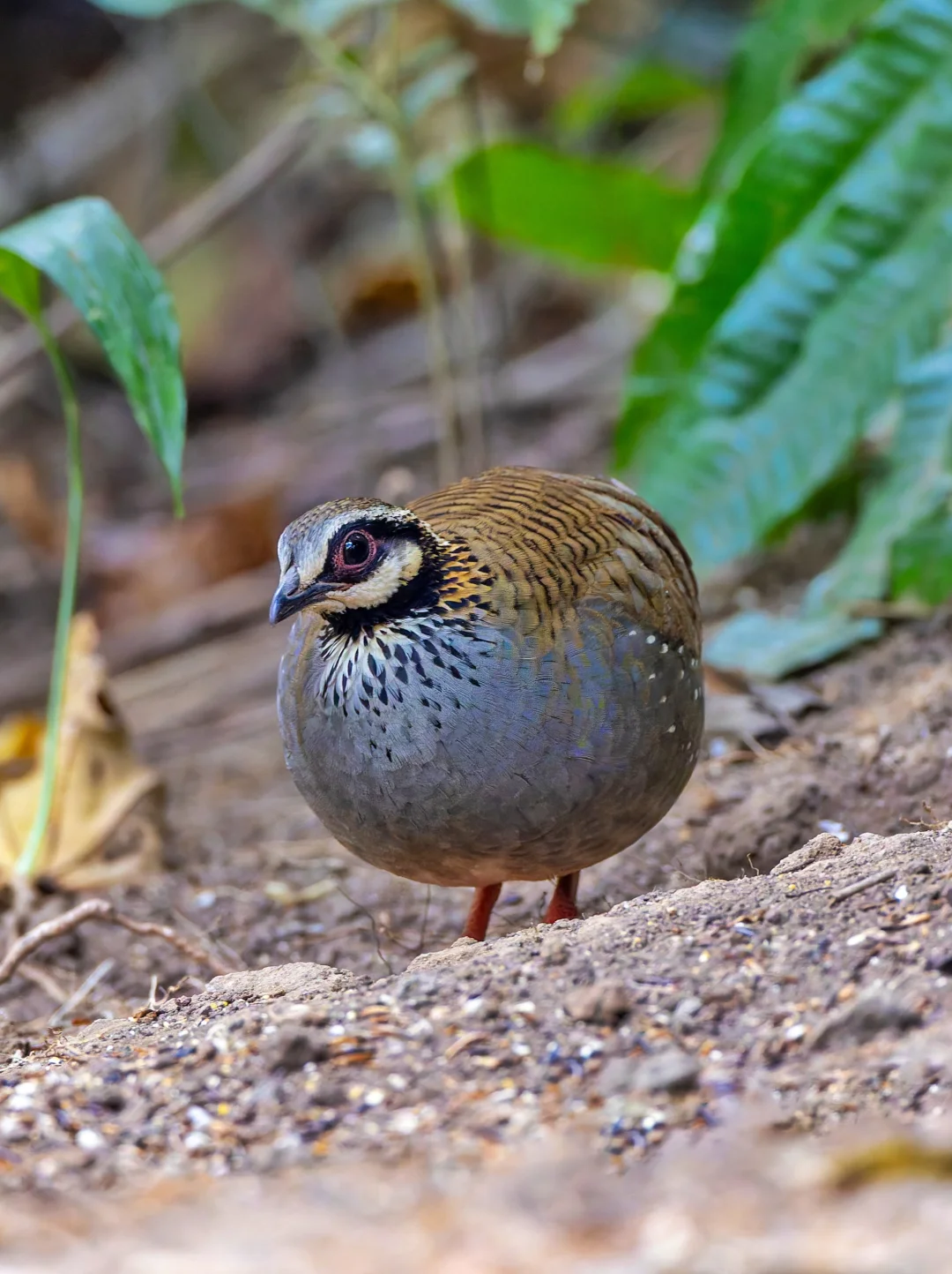 原创拍摄于2026.02 白颊山鹧鸪,White-cheeked Partridge,鸡形目雉科山鹧鸪属。分布于喜马拉雅山南麓,我国只有盈江可见的漂亮小鸡。 白颊山鹧鸪有一个白色的脸颊斑块,和其他山鹧鸪明显不同。另外我觉得很漂亮的是腹部的灰色,似乎有金属光泽,看上去有点蓝,加上两胁还有白色泪滴状斑纹,真的是很漂亮。 国内的9种山鹧鸪现在到7了,不过剩下两种暂时有点难了。。