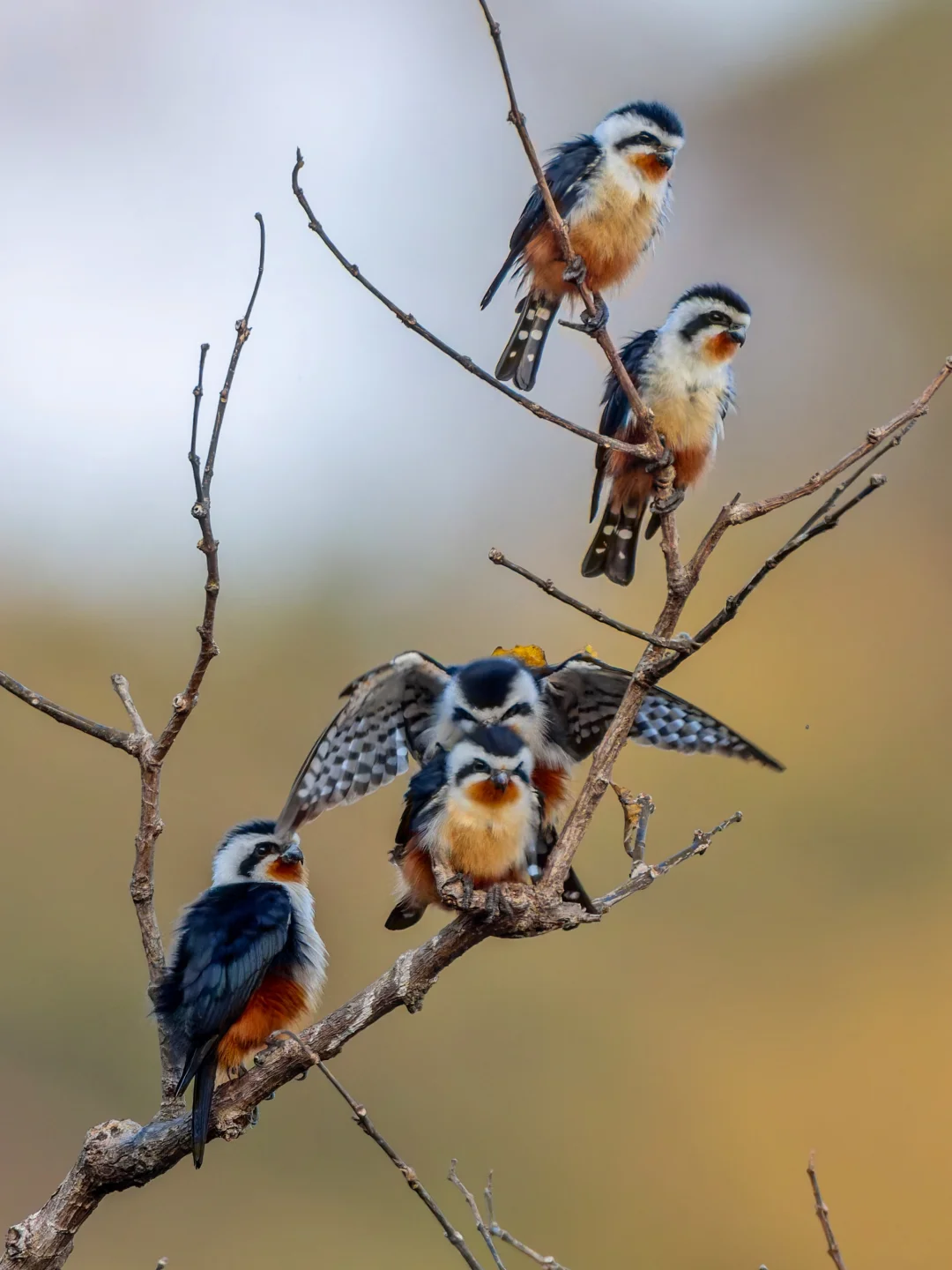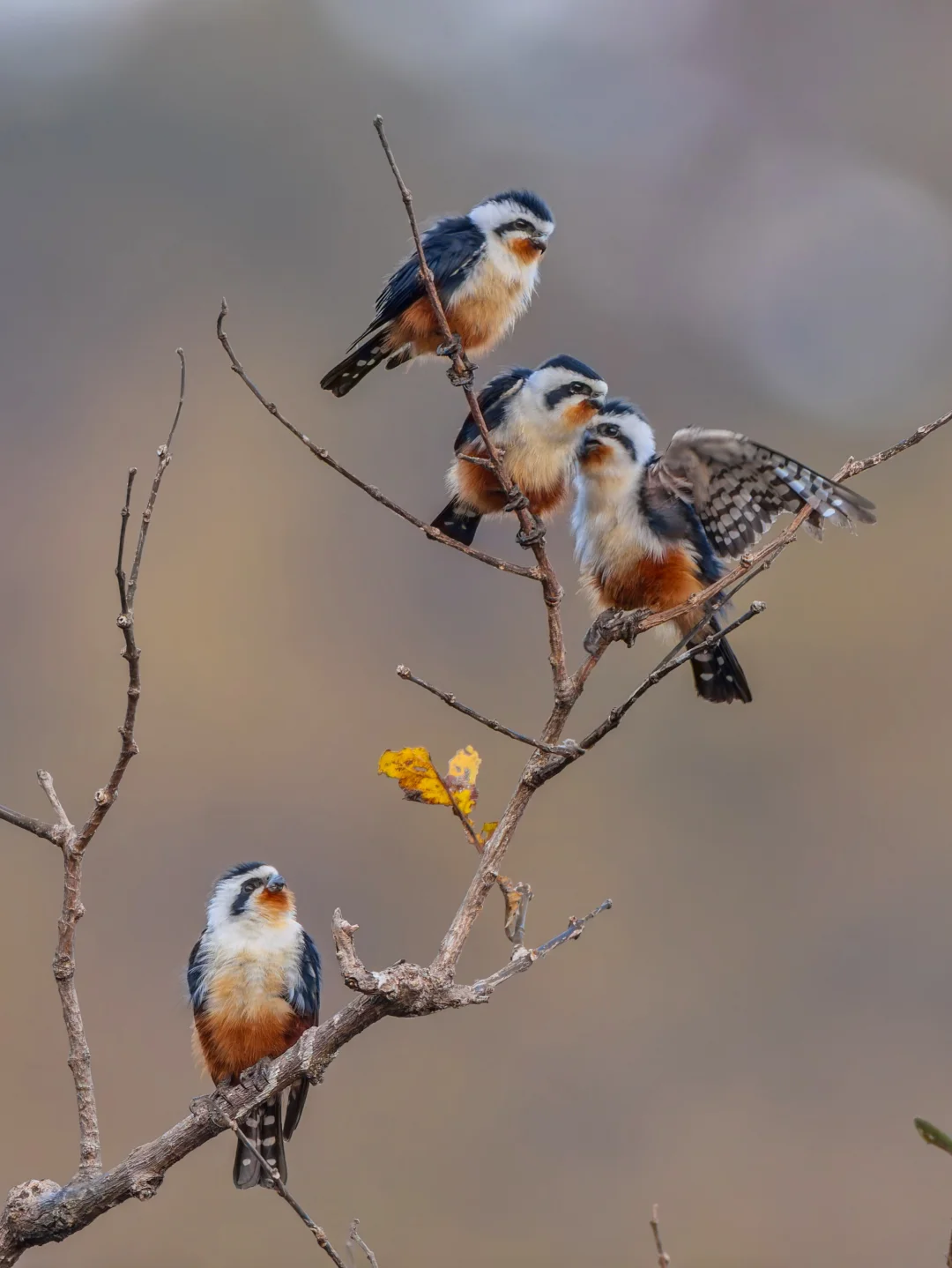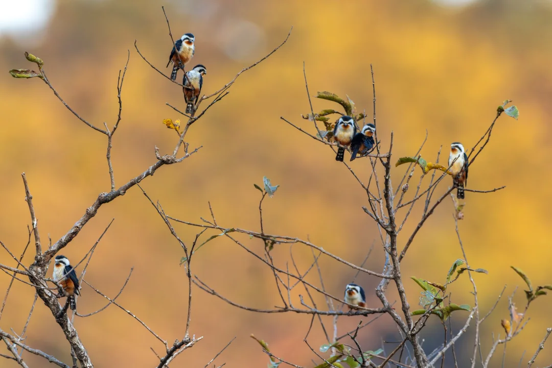 原创拍摄于2026.02 红腿小隼,Collared Falconet,隼形目隼科小隼属。是世界上最小的猛禽之一,和麻雀差不多大小,和白腿小隼是不同的皮肤小可爱。 在盈江,它们看上去在早出晚归时喜欢凑在一起社交,这次竟然有幸看到7只同框p3。当然这个傍晚确实也是红腿小隼们激情之夜,多次的交配场景被拍到都有点害羞了。