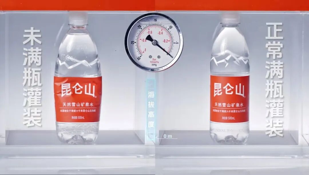 品牌第一时间推出“真空箱对比实验”视频:视频里,通过真空箱模拟产品从高海拔水源地到消费者所在平原地区的变化过程,直观呈现——昆仑山的水源在海拔6000米的玉珠峰,工厂就建在水源地核心区,是世界上海拔较高的矿泉水工厂。高海拔气压低,如果不灌满,瓶子运到平原后,会被气压差压变形。所以只能把水灌得满满当当,紧贴瓶盖,这才导致“开瓶洒”。