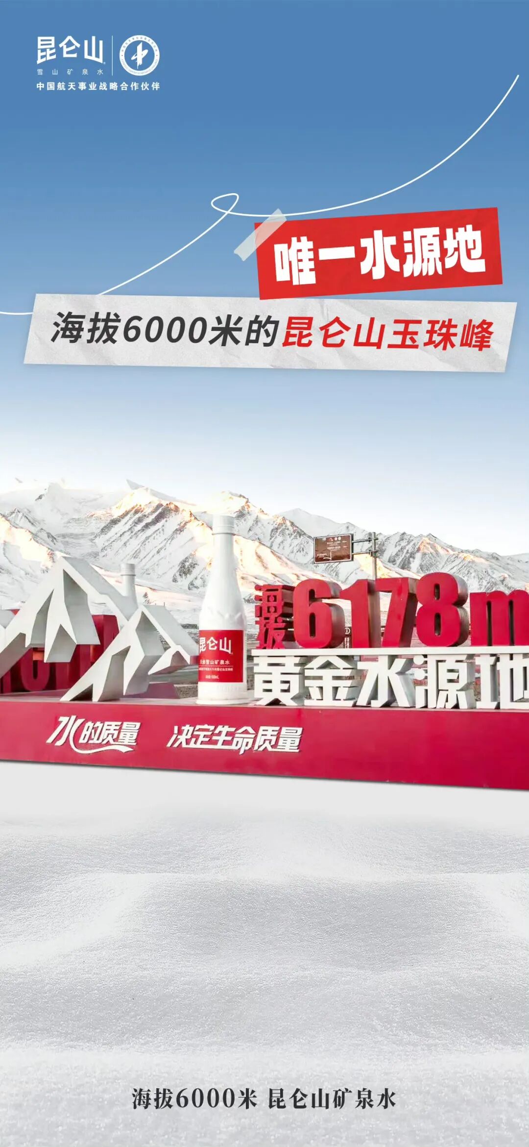 随后,昆仑山矿泉水通过一组创意海报进一步点明:“开瓶洒”不是缺陷,而是高海拔好水的天然防伪密码——只有100%水源地直采,才会有“开瓶洒”的现象。将“洒水”现象与海拔6000米水源地深度绑定。