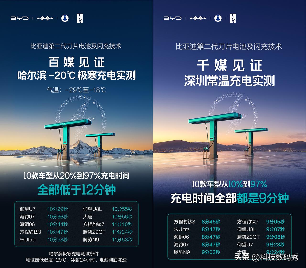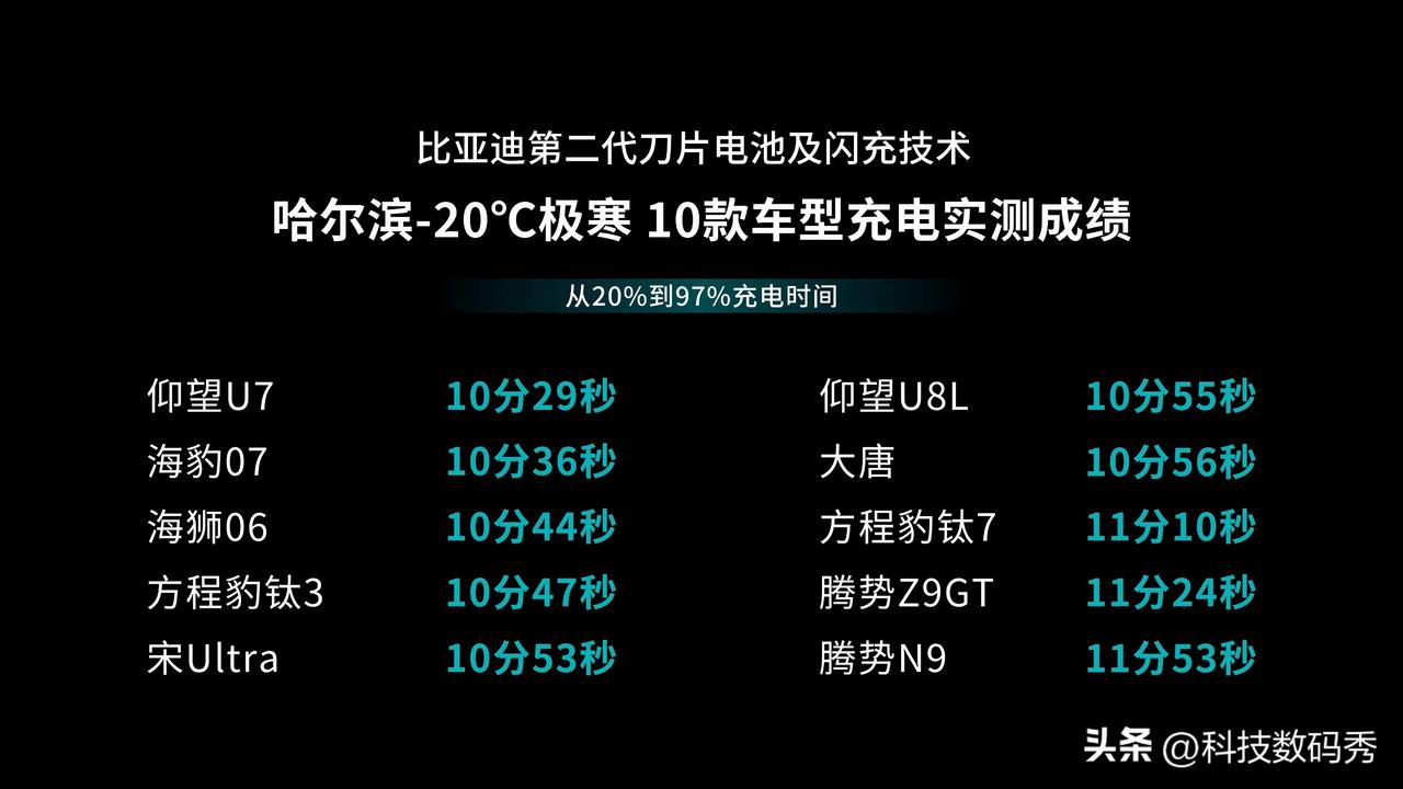 都说比亚迪六年磨一刀,这次的闪充技术真的太硬核了,全汽车圈知名自媒体和新闻媒体都来见证比亚迪在哈尔滨-20℃(实际气温最冷是-29℃)零下严寒状况下的充电速度,事先对电池进行冰封24小时,电池彻底冻透,通过实测,比亚迪仰望U7、海豹07、海狮06、方程豹钛3、宋Ultra、大唐、钛7、腾势N9等等,都是7分多钟就能充到70%、80%以上,而充至97%的时间,比常温状态下也只不过由9分钟仅仅增加了3分钟,在12分钟以内全部完成了从20%充至97%的极速充电。 这结果真的是令所有在场的媒体老师大为感叹,纷纷表达了比亚迪硬核闪充技术树立行业新标杆,这是在真抓实干为整个新能源汽车行业解决难题,包括滑轨闪充的实际体验让媒体老师当中的妹子们也觉得很轻很方便,对于今年想入手新能源电车的车主们来说,比亚迪第二代刀片电池+新的闪充技术,无疑是更让人值得购买的选择!