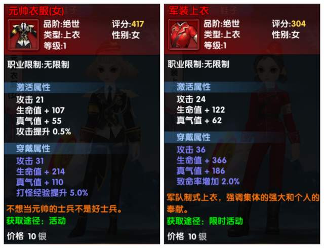 深度解析:▶️ 元帅装:1%生命+0.5%攻击(百分比成长,越后期越强)+15%经验加成(挂机神器)▶️ 军装:2%攻击+2%暴击+2%生命(打架专用)