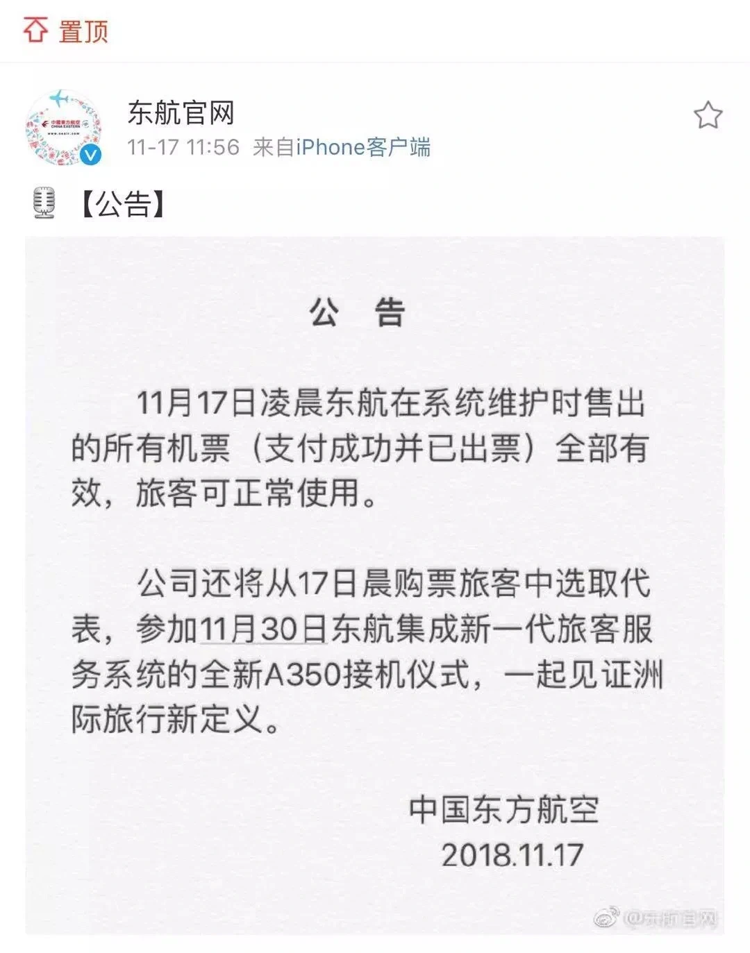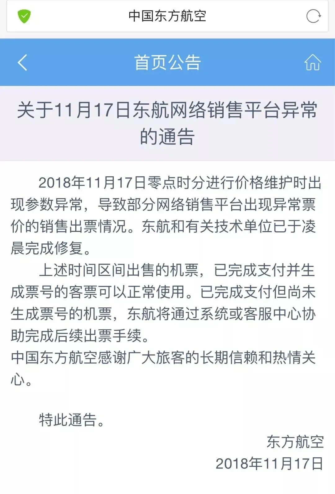 东航在事件发生几个小时后就在官网给出了答复。