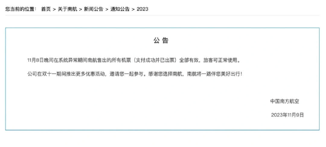 11月8日晚间在系统异常期间南航售出的所有机票全部有效,旅客可以正常使用!