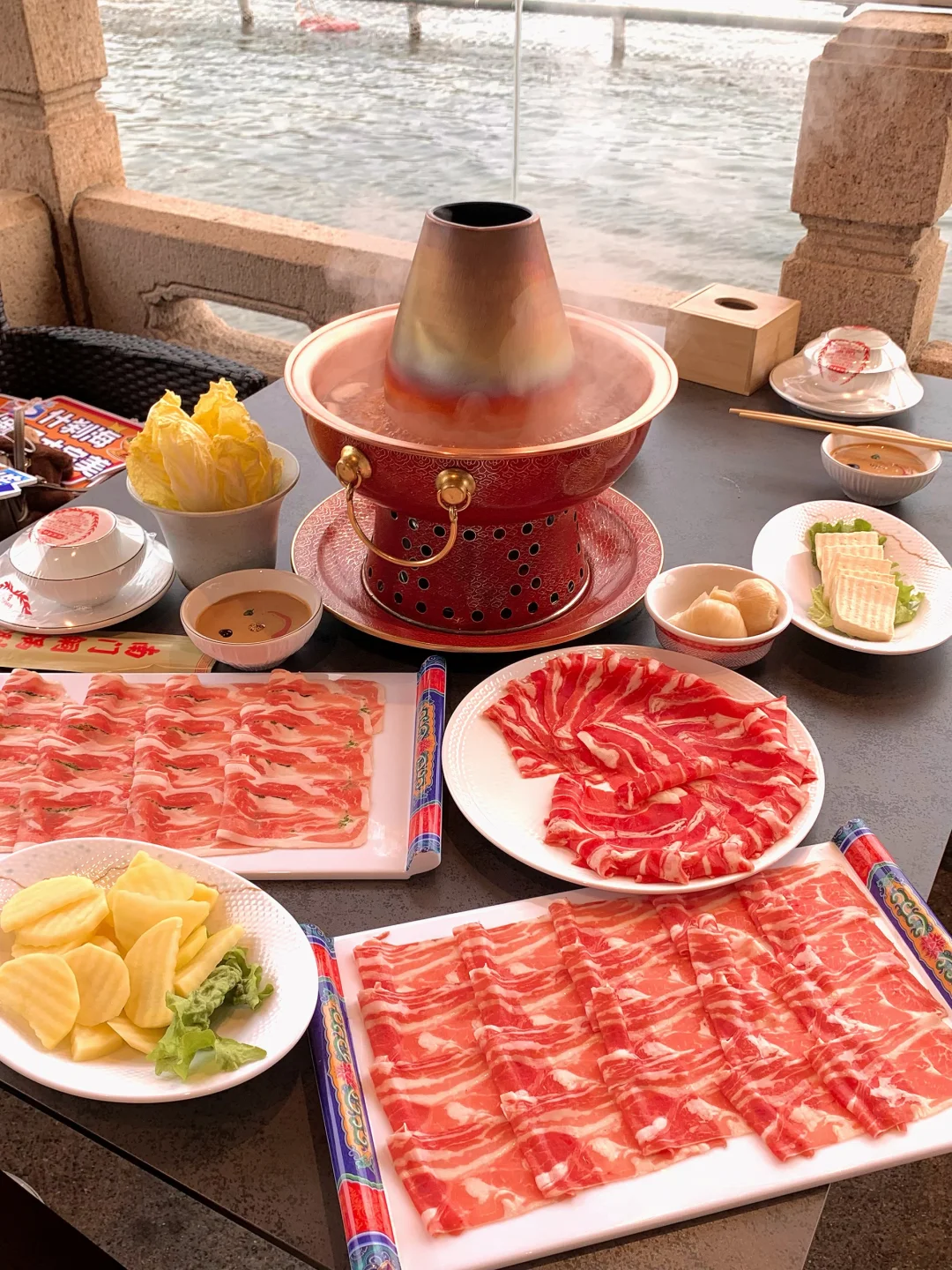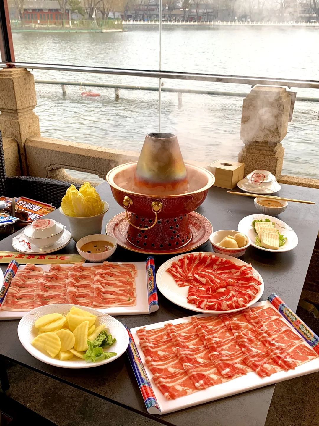 今天来什刹海附近溜达 ~ 来吃种草很久的一家火锅店[黄金薯R] 👉地址:北京市西城区什刹海街道荷花市场环境区👈 在什刹海河边、推开窗就能看见景色✨ . 铜锅旺火沸腾,清汤慢煮本味鲜香 手切鲜羊肉薄如蝉翼,嫩而不膻 蘸上秘制麻酱,一口沦陷地道京味。 推荐点双人餐、价格合适~ 量大、我们两个女生都没吃完! 店内人员服务很好、热情周到~ 用餐体验很好! 逛累了可以来南门涮肉(后海观景店)在什刹海河上,围炉而坐,吃涮肉~