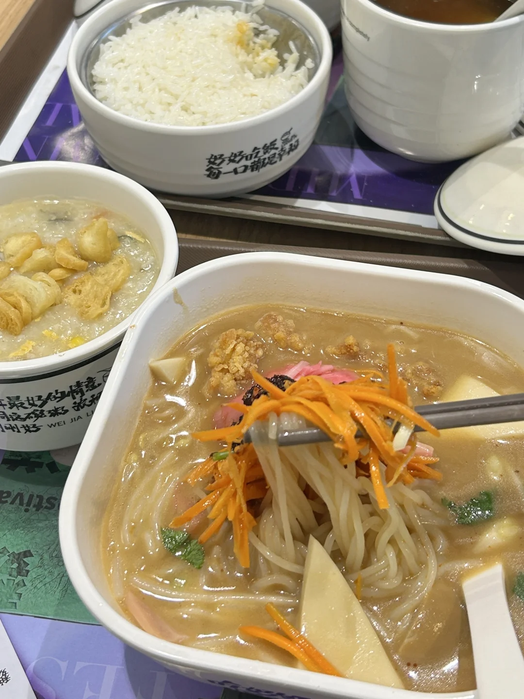 配菜丰富是其最大亮点,通常有炸鸡米花、豆芽、玉米粒等,喜欢的人称之为“真香”最爱,无感的人则觉得平平无奇,更像速食产品的味道(不能吃辣的朋友推荐三鲜米线哦🥳)