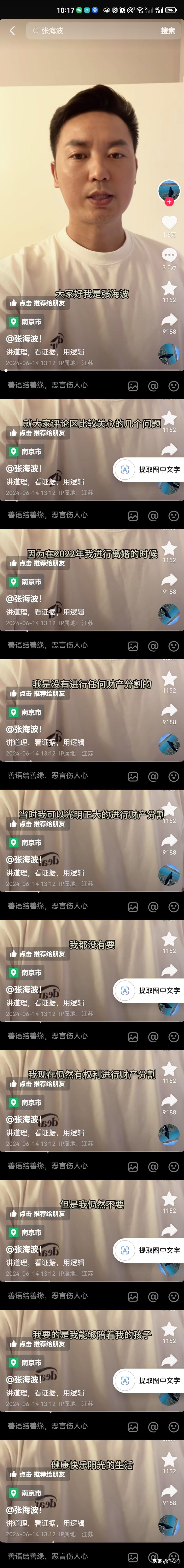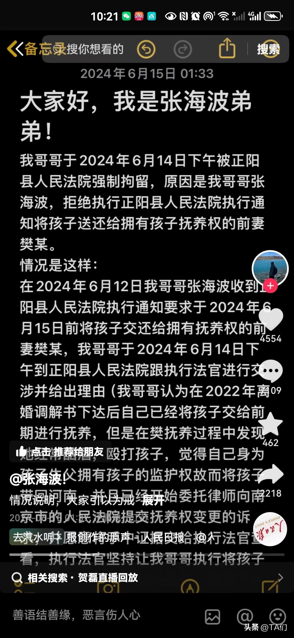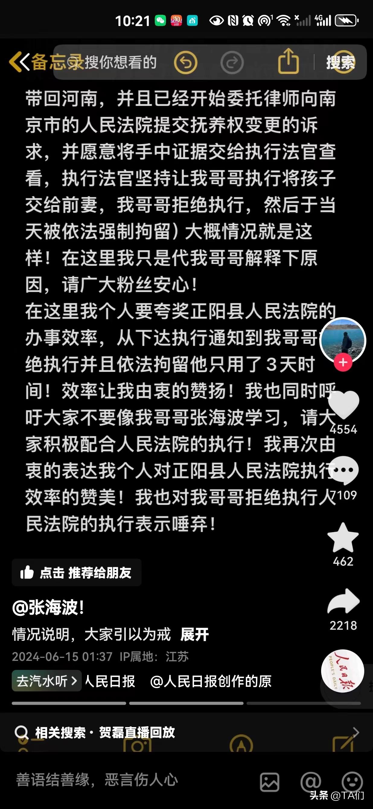 千万网红樊小慧前夫被抓,评论区一片呼声! 继前段时间千万网红樊小慧被前夫张海波强行带走孩子后,两人开始在网上互撕。之后消停了几日,就在网友们疑问后事如何时,6月14日下午,张海波通过抖音账号发布视频,回应网友几个问题:1、自己有权分割财产,但放弃了,只为陪孩子;2、草莓印为樊小慧制造,多个恩爱视频也是摆拍;3、八年间四次是不存在的(打脸央视吗?);4、工资卡一直有樊小慧保管,不存在不给他们母子花钱说法;5、张母一直在帮带孩子,已经起诉樊小慧。 而当日几个小时后,樊小慧一针见血地戳穿了张与三儿的丑闻。 就在网友们深夜感慨之际,有一个惊天大瓜出现:张海波被正阳县法院拘留了! 天哪!这个翻转,有点太突然了。昨天樊小慧还说,张说在布一个大局,难道是在局子里布?! 更有张海波弟弟出面声明:以此为戒!不要向哥哥学习! 樊小慧更是连发多个视频,为正阳县法院点赞,并方处长与正阳县法院的威胁对话。 天哪!这么突然的大反转!张海波的脸,此时不知疼不疼? 后台评论更是一片欢呼! 关于樊小慧与前夫撕扯轮战详情,可到我主页文章查看来龙去脉!