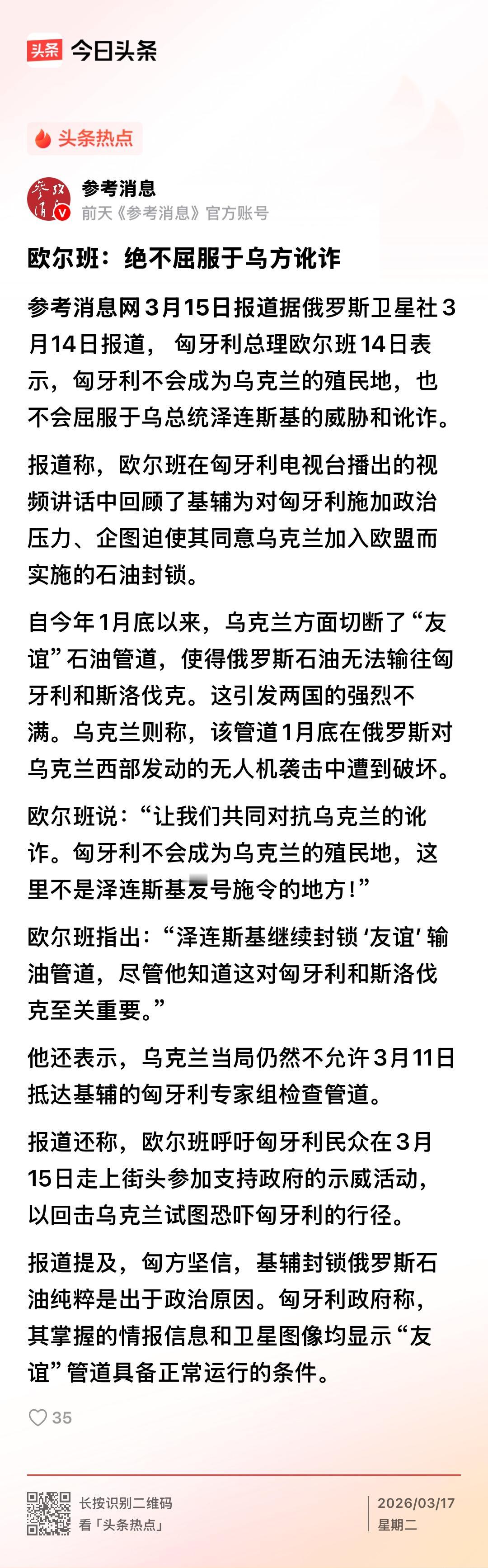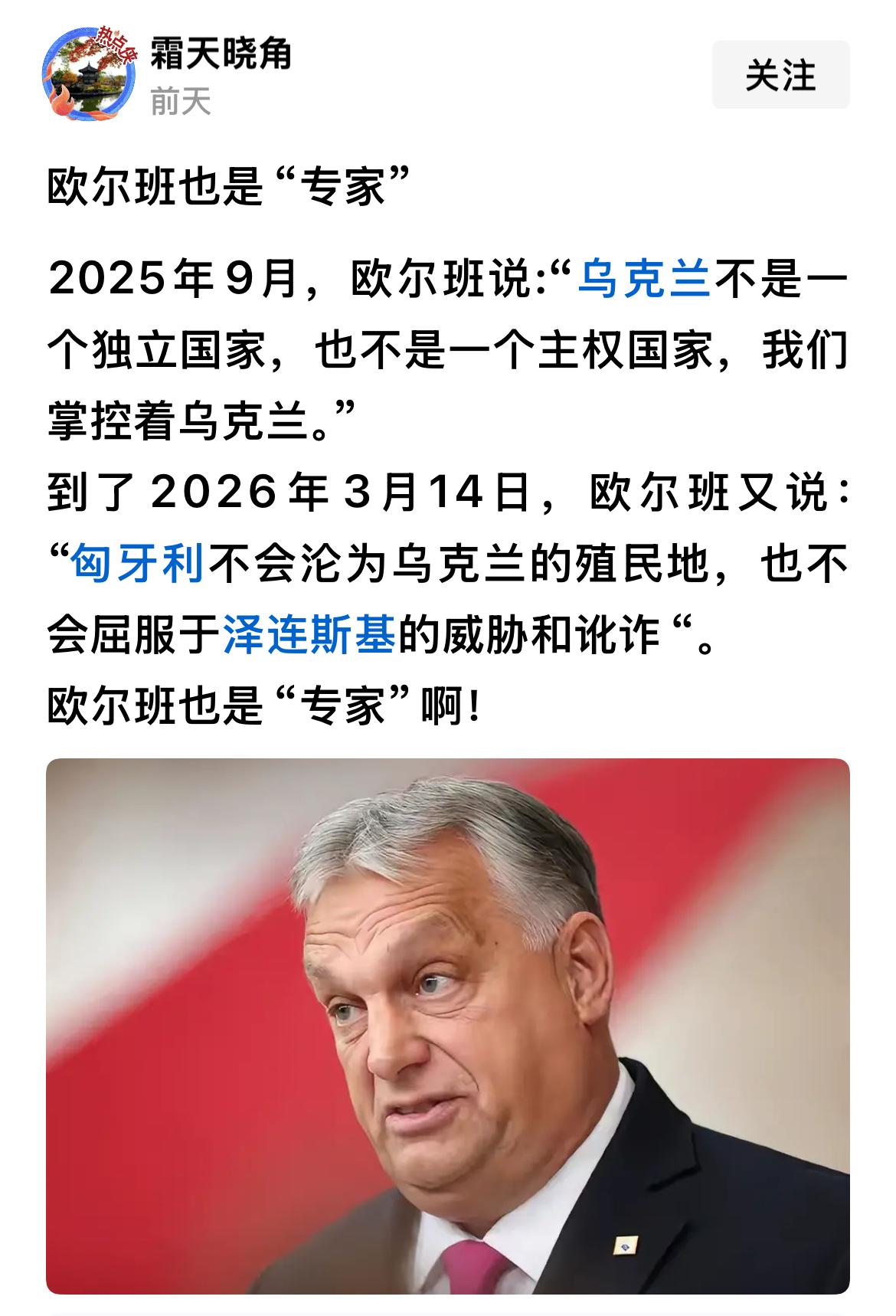 2025年的欧尔班曾经说“乌克兰不是一个主权国家”,2026年的欧尔班却又说“匈牙利绝不做乌克兰的殖民地”。 这都哪跟哪啊?为了拉选票也没必要这么不着调吧?去年还被自己抨击为“不是主权国家”的乌克兰,一转眼就成了殖民国家! 要知道,乌克兰四年来一直在艰难抵抗俄罗斯的武装侵略,哪有能力和空闲去“殖民”匈牙利呢? 苏系国家就是这样,总是能在面对同一个问题时,根据需要娴熟地使用两种不同的逻辑。 不是因为他们的逻辑学有多好,而是因为苏系在这方面的基因实在是太强大,除非发生一次基因突变,否则,在未来很长一段时间里,他们都将在这方面遥遥领先。