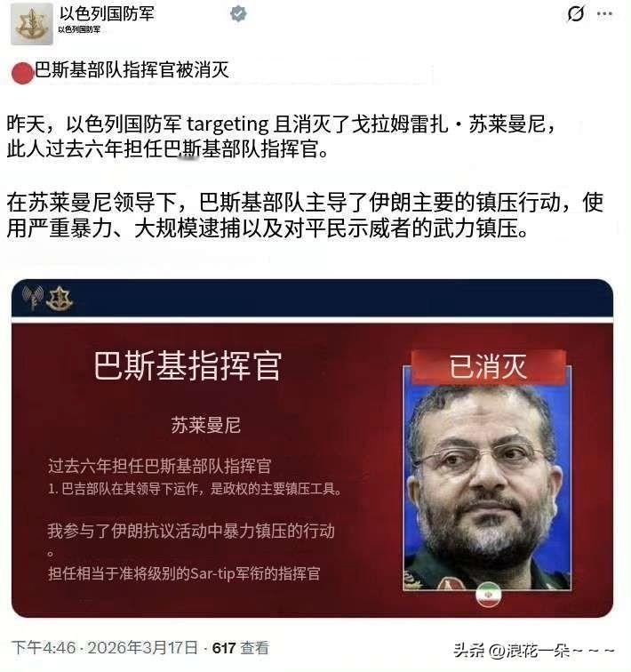 此前,以色列国防军表示:“3月16日,以色列空军根据以色列国防军情报发动了袭击并击毙了过去六年一直指挥巴斯基民兵的苏莱曼尼。”