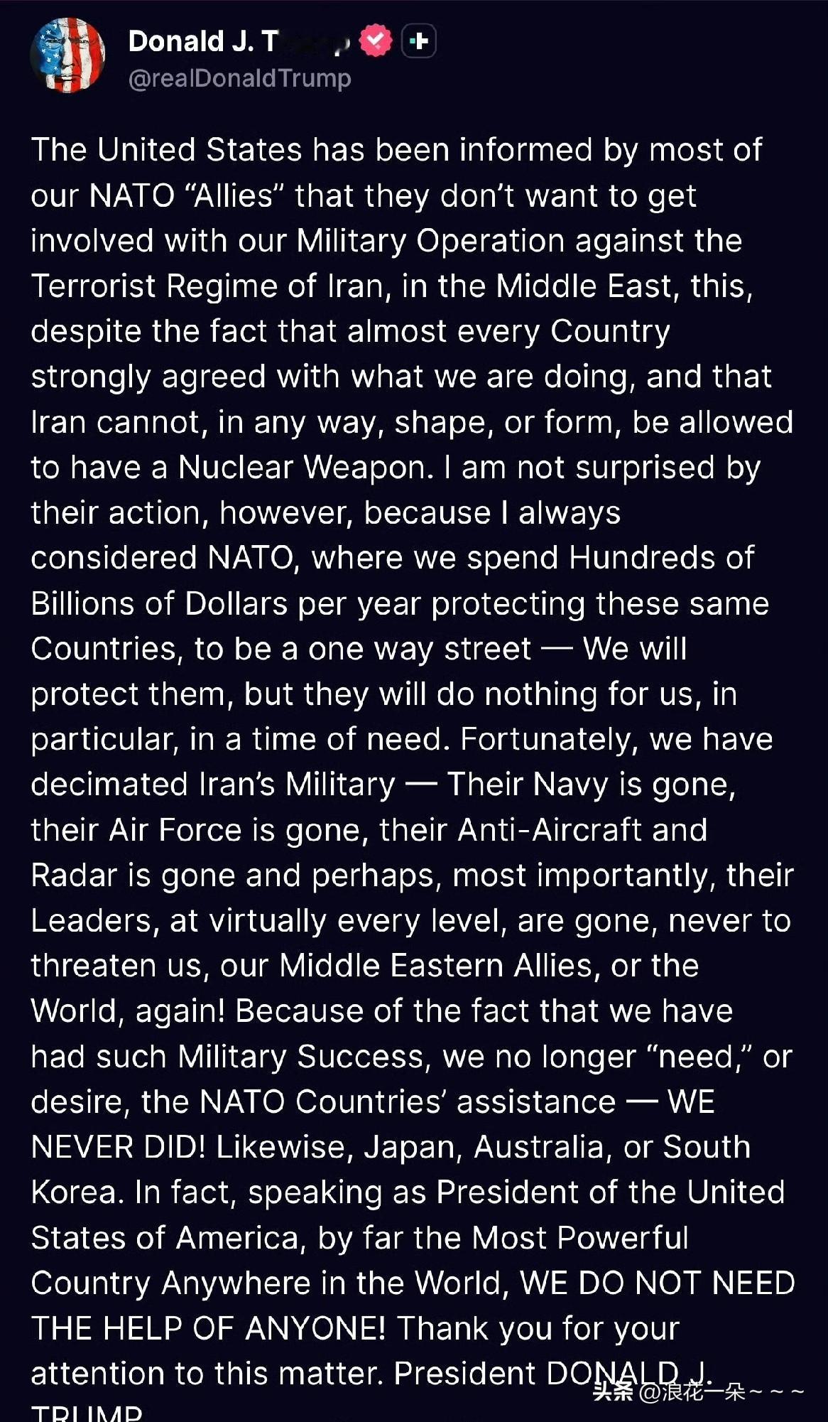 特朗普的意思很明确了,叫你们来帮我你们不来帮,你们不来帮就算了,反正我早已经有预感,我们自己很强大,我们能解决所有的问题,以后你们还是得靠我。