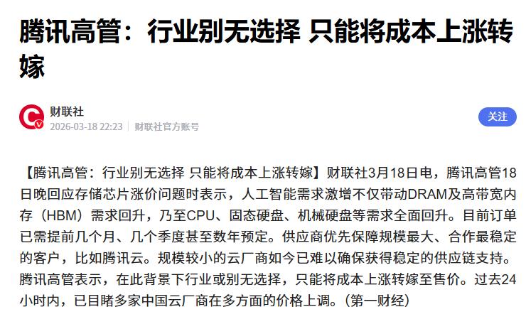 腾讯高管谈存储涨价:行业别无选择 作为全球科技企业面临的共性问题,近期腾讯高管也就“内存涨价” “存储芯片涨价”一事发表了自己的意见。其认为,目前DRAM、CPU、固态硬盘等产品的需求全面回升,且供应商会优先保障规模最大、合作最稳定的客户。 尤其是在订单需要提前几个月、几个季度甚至数年预定背景下,中小型厂商已经很难获得稳定的供应链支持。至于涨价问题,在上述情况下也将无可避免,靠涨价转嫁成本压力或许会愈发常见。