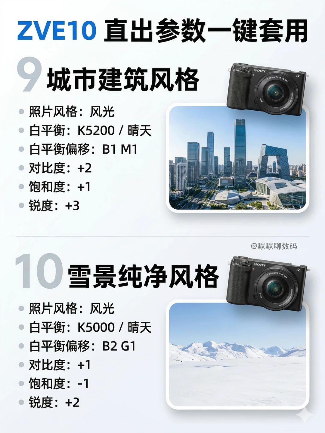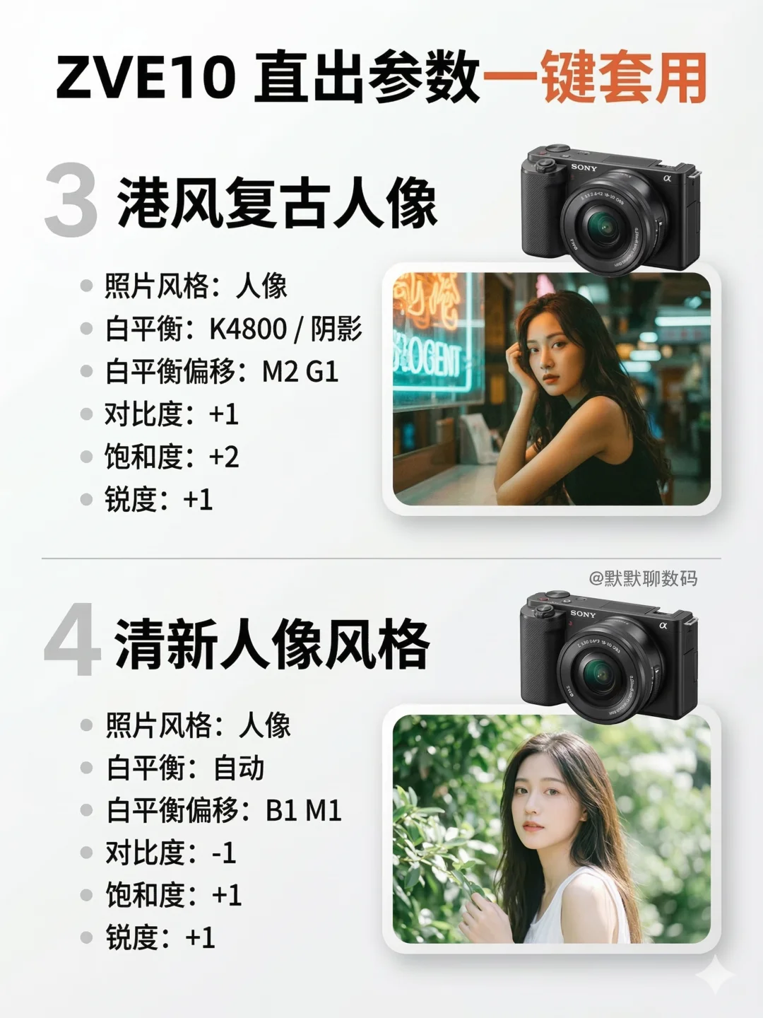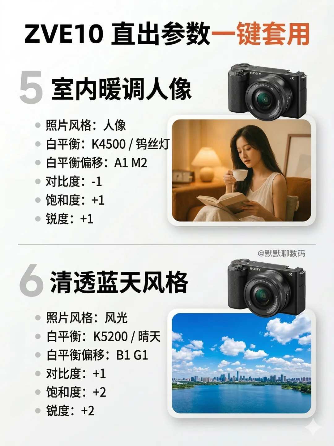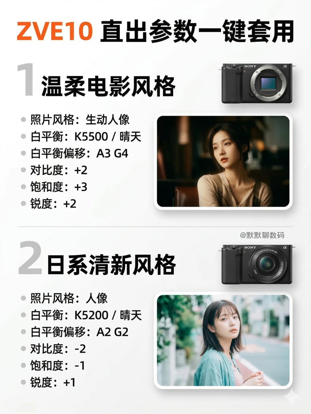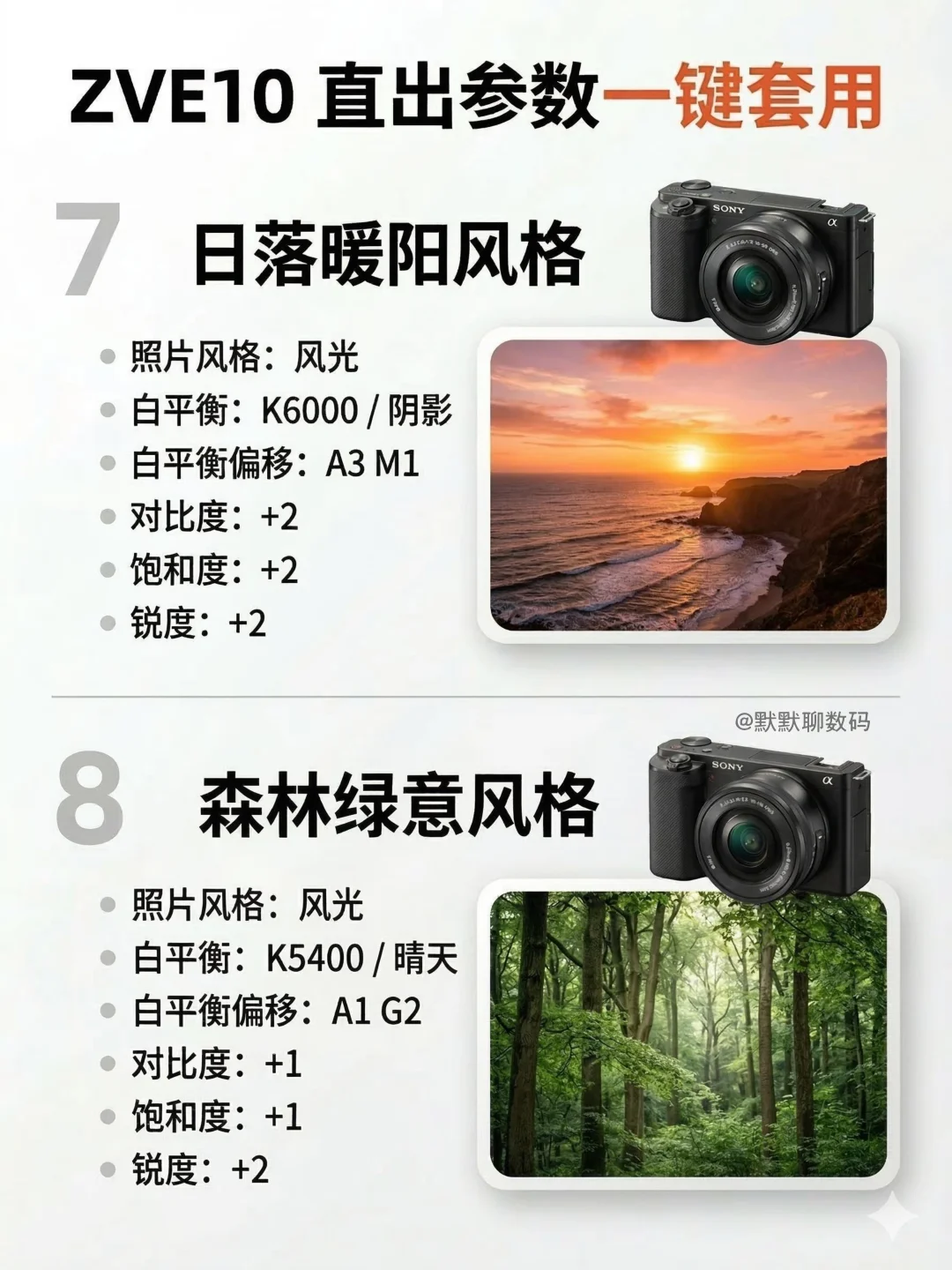 姐妹们!终于把ZVE10直出参数整理出来了,分上下两篇,直接照抄就行! 我之前调参数也是一通乱调,后来发现只要设置对照片风格和白平衡偏移,直出就能好好看! 这个系列一共有两篇,今天会先发(上篇),记得回来看👀(下篇)哦!