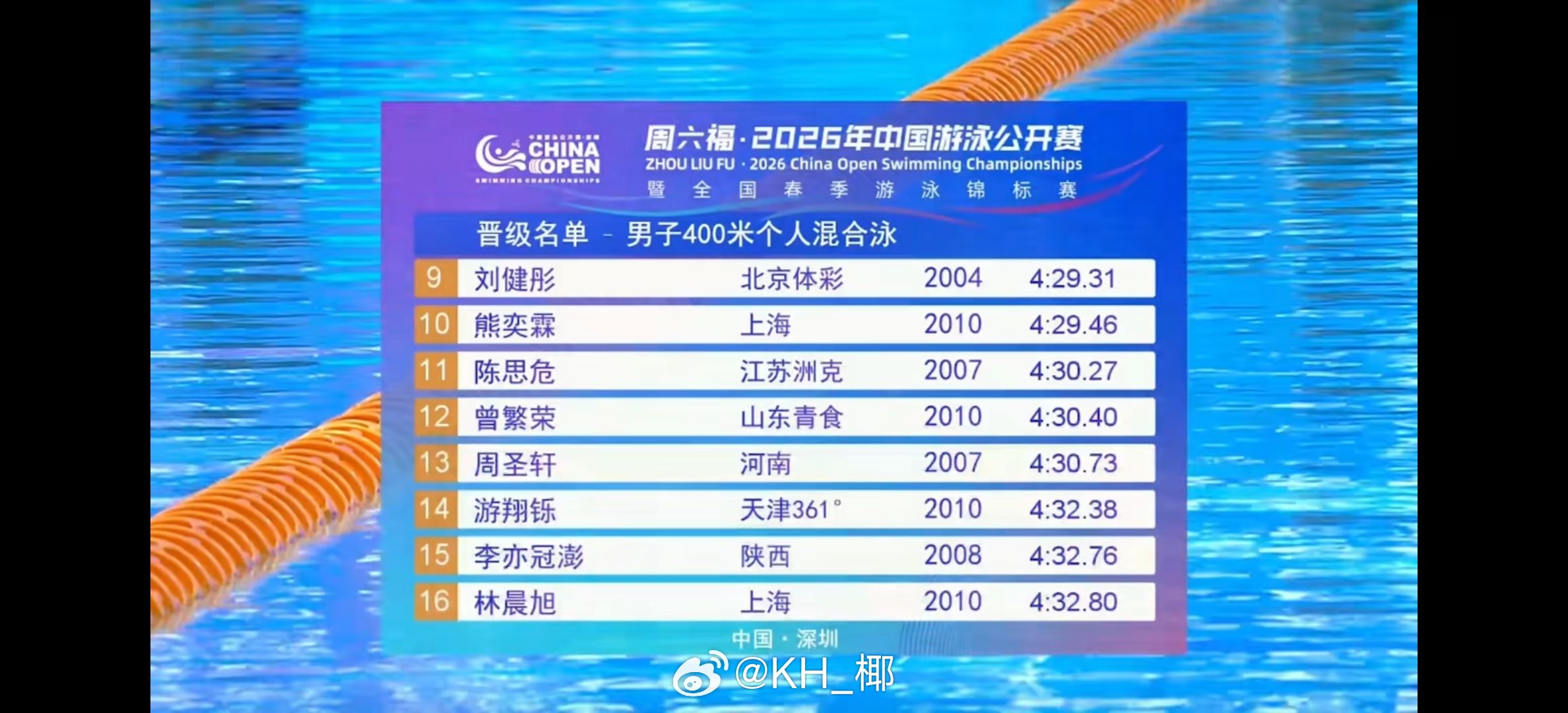 2026年中国游泳公开赛 男400混预赛🇦🇺Petric 4:20.02顾恩翊 4:22.46陶冠男 4:23.07陆屹宸 4:23.61柯华硕 4:25.04谢以忱 4:26.67陈梦翔 4:27.91罗昱淳 4:28.85刘健彤 4:29.31熊奕霖 4:29.46 陈思危 4:30.27 曾繁荣 4:30.40