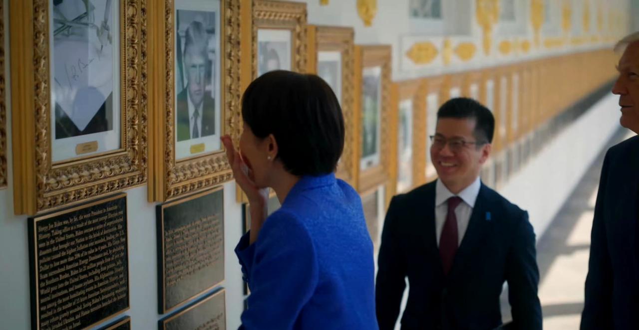 特朗普带高市早苗参观总统星光大道 高市看到特朗普肖像非常激动,随后看到拜登的“自动签名笔”捂着嘴笑了出来。