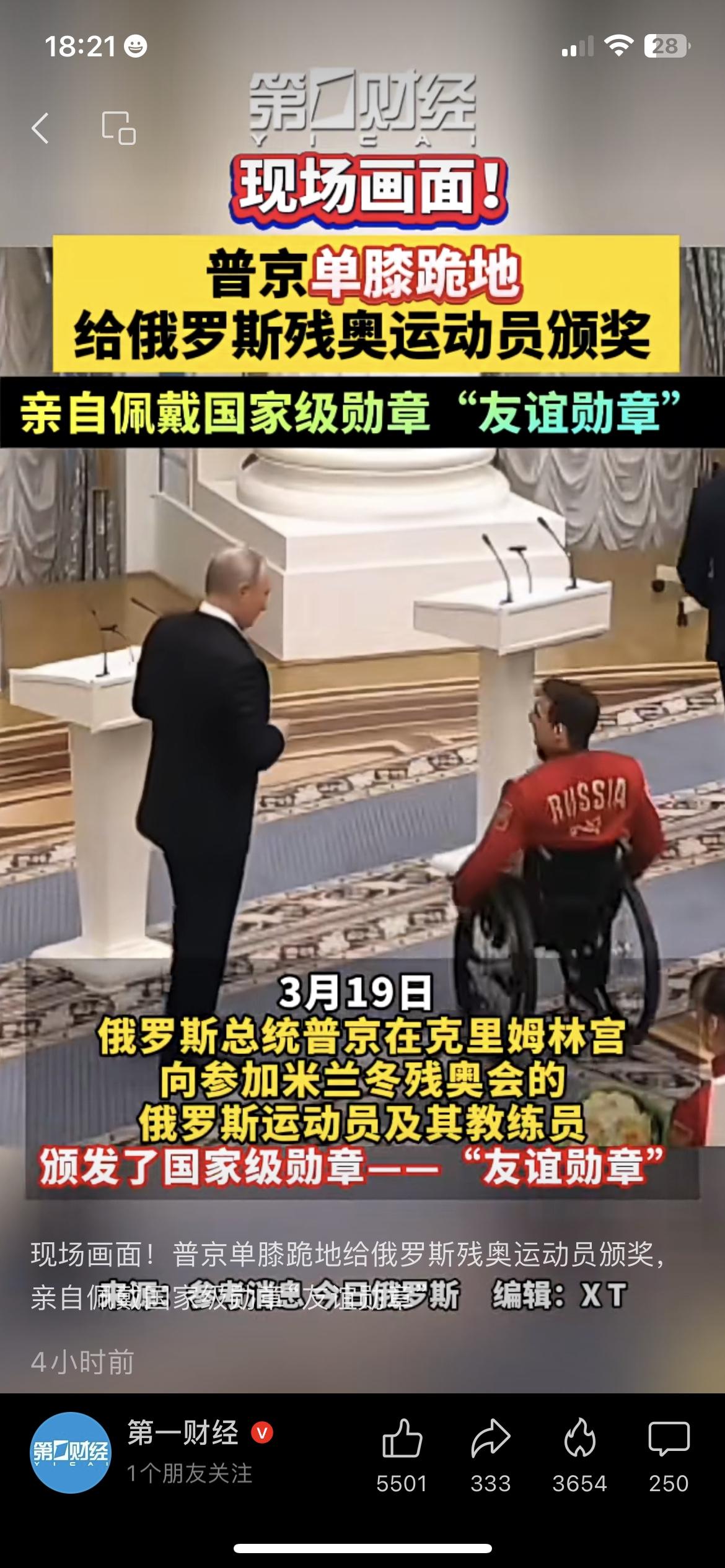 单膝跪地为残奥运动员颁奖!普京这一跪,看哭无数人 3月19日克里姆林宫,普京单膝跪地,亲自为坐在轮椅上的俄罗斯残奥运动员佩戴“友谊勋章”。这一跪,不是低头,是对体育精神的最高致敬,是对坚韧不拔意志的真诚尊重。网友纷纷留言:“这才是真正的大国风度,细节里藏着温度”“看哭了,尊重每一个为梦想拼搏的人”。这一幕,比任何华丽的演讲都更有力量。 普京 残奥运动员 友谊勋章