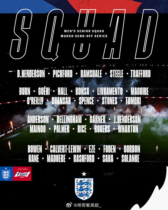英格兰本月底将坐镇温布利球场进行两场热身赛,分别是北京时间3月28日凌晨3:45对阵乌拉圭、4月1日凌晨2:45对阵日本。美加墨世界杯 英格兰队