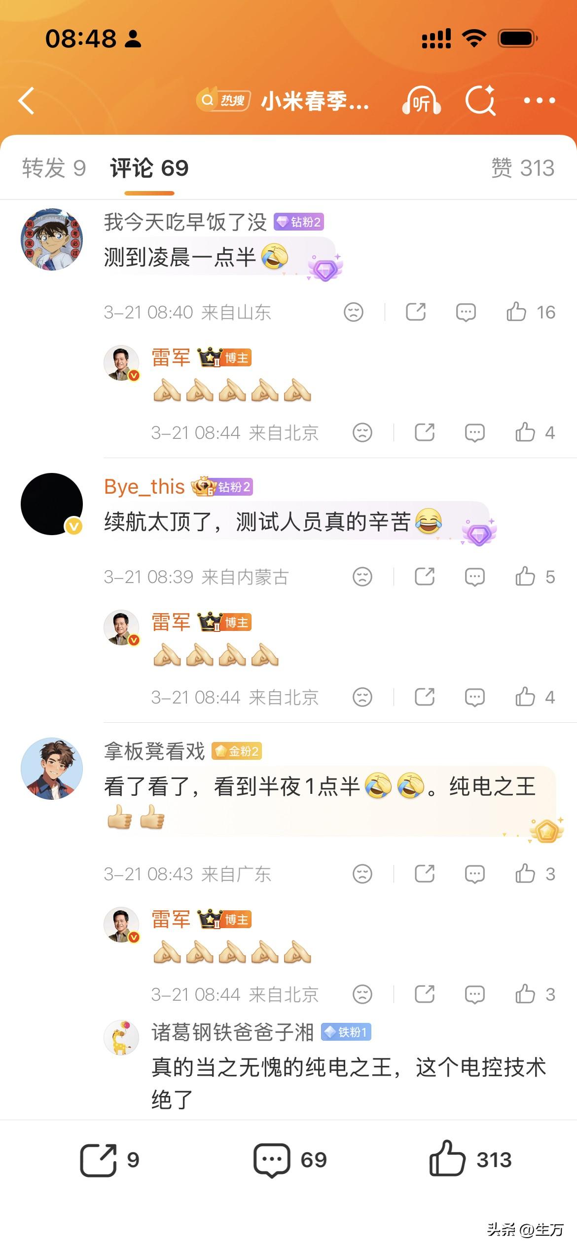 雷军:新一代SU7 Pro,实测续航达到829.9公里,达成率92%! 就在刚才,雷军在社交网络展示了汽车之家,专门来测试新一代的小米SU7 Pro版本的真实成绩,没想到这个车一口气跑出了差不多830公里! 和他们标的理想工状状态下的工作902公里差不了多少,达成率来到了92%!看得出来他有点兴奋,所以他才把这个成绩拿出来。 搞这个测试的是汽车之家,昨天他们一直测到凌晨1:30,连续跑了十多个小时,最终的成绩出来之后,确实让看直播的很多人,尤其是这个车的潜在车主心里面比较舒服,不知道很多同行看了几个成绩之后什么感觉。 因为能够做到实际的续航达成率过90%,这种成绩在行业里面真的不多见,不过还好,最终这一批测试人员用他们的行动把这个数字弄出来的时候,还是值得的。 所以雷军在评论区也连续的对这些工作人员表示辛苦了,不知道这个成绩有没有打消那些还在观望的用户的顾虑。