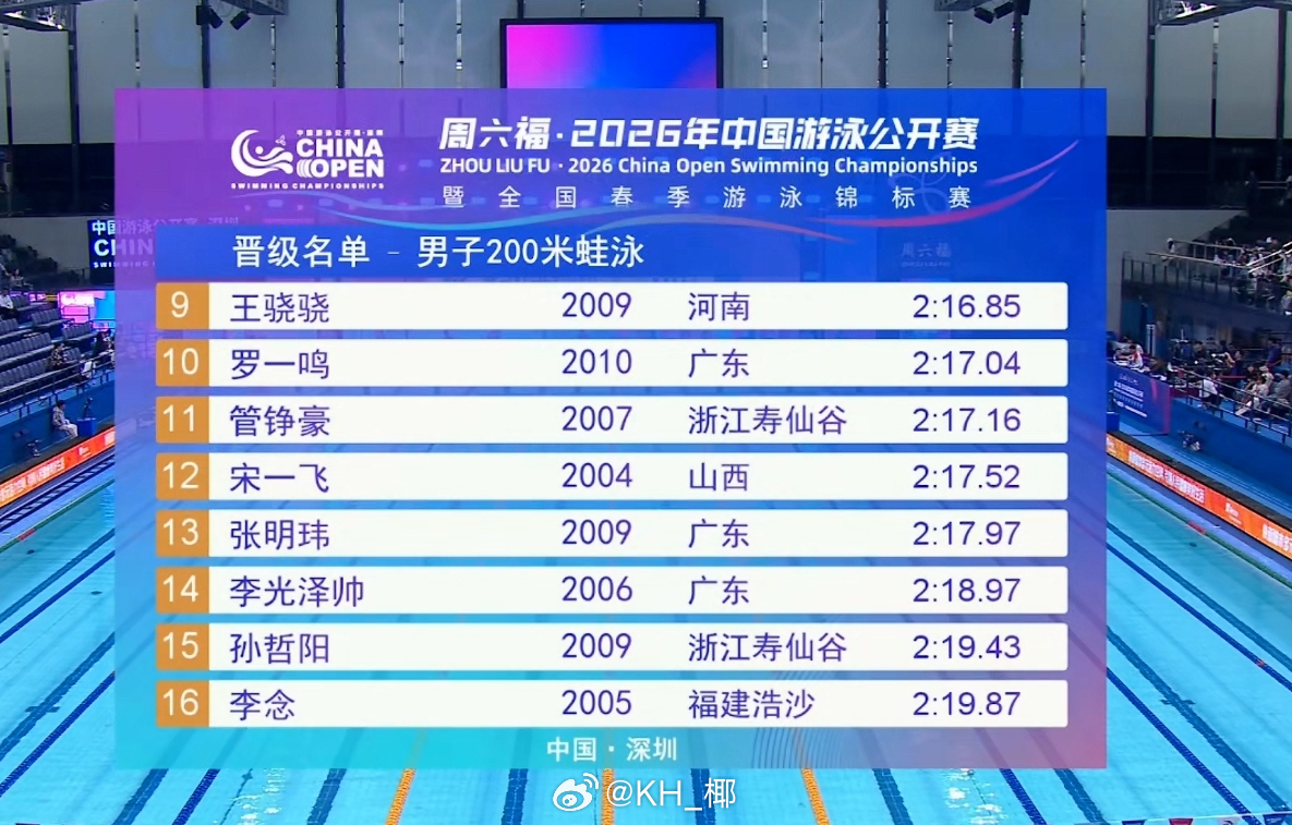 2026年中国游泳公开赛 男200蛙预赛🇳🇱卡明加 2:12.60余宗达 2:12.64董志豪 2:14.84🇦🇺Petric 2:15.03熊文瑞 2:15.08王骏腾 2:15.77唐一宸 2:16.21刘俊杰 2:16.49王骁骁 2:16.85罗一鸣 2:17.04管铮豪 2:17.16宋一飞 2:17.52张明玮 2:17.96李光泽帅 2:18.97孙哲阳 2:19.43 李念 2:19.87