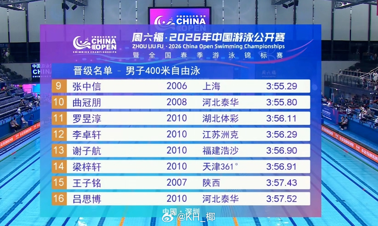 2026年中国游泳公开赛 男400自预赛🇩🇪Martens 3:50.10徐海博 3:51.02张展硕 3:51.86陈羿名 3:52.46刘培鑫 3:52.80李城宇 3:53.44陈声鑫 3:53.92 龚浩宇 3:55.12张中信 3:55.29曲冠朋 3:55.80罗昱淳 3:56.11李卓轩 3:56.29 谢子航 3:56.90梁梓轩 3:56.91王子铭 3:57.43吕思博 3:57.52