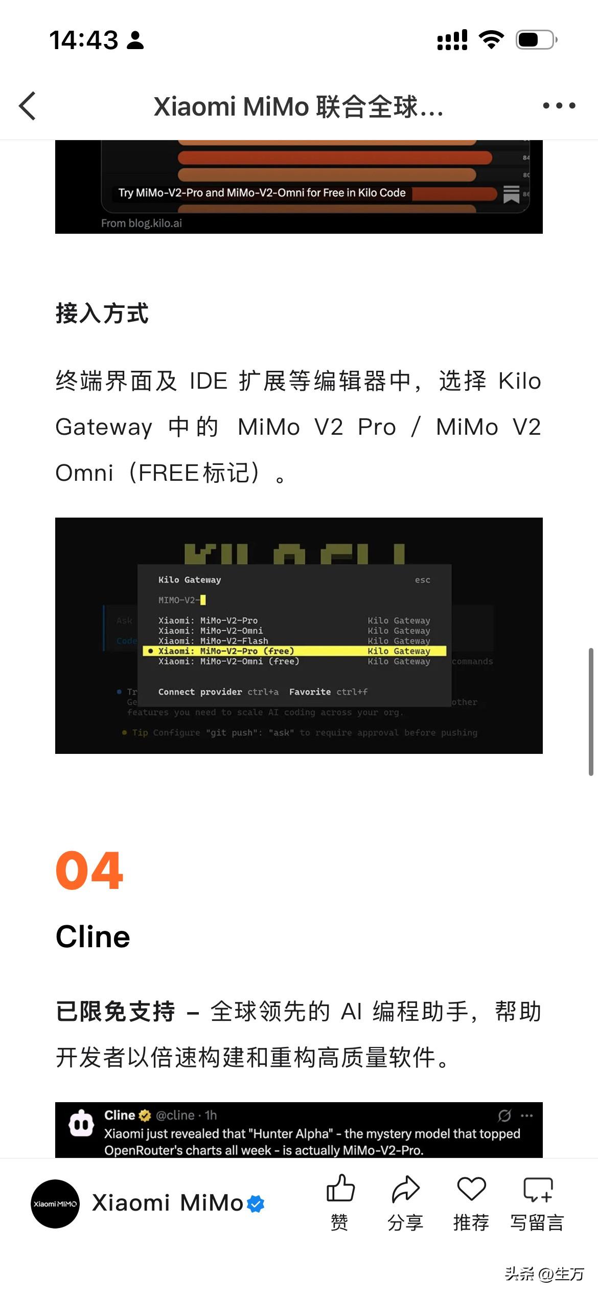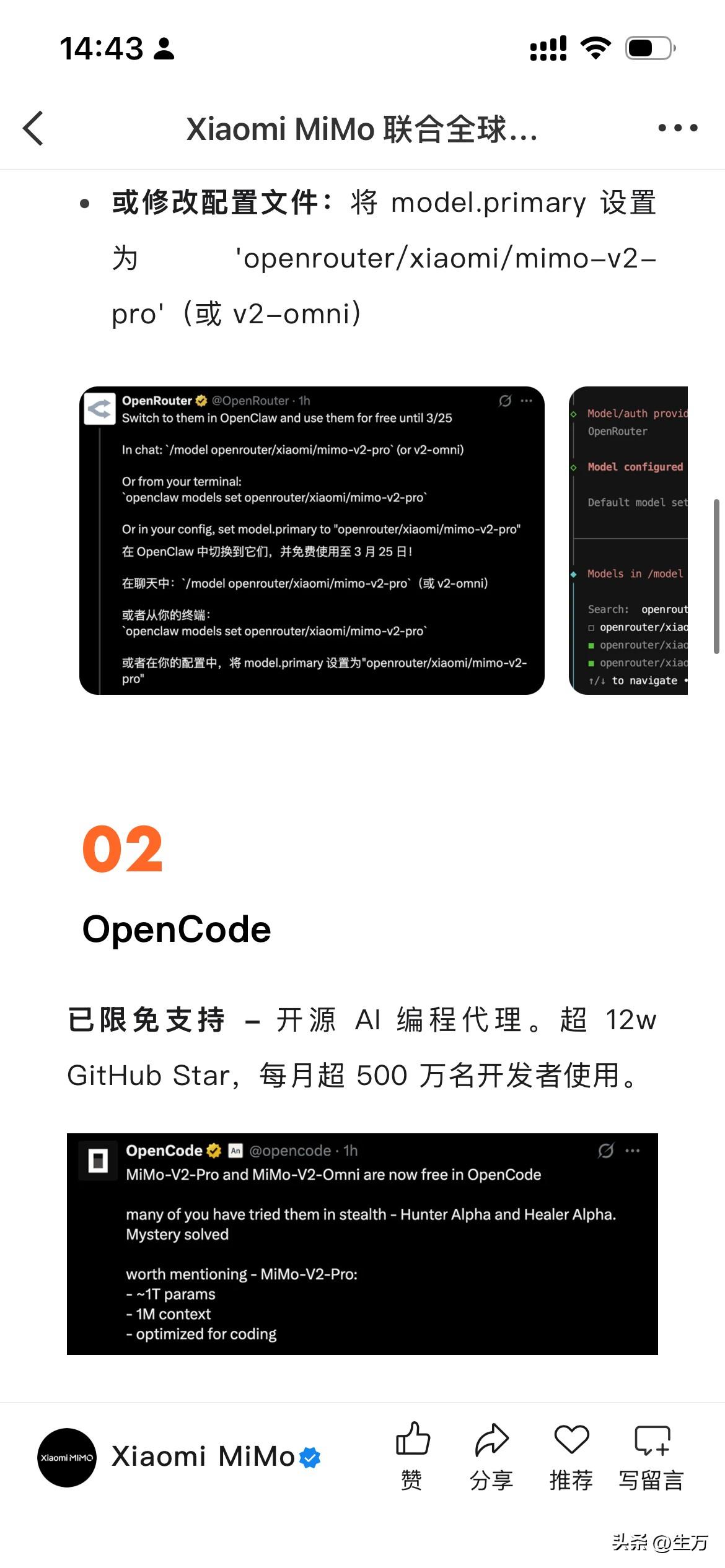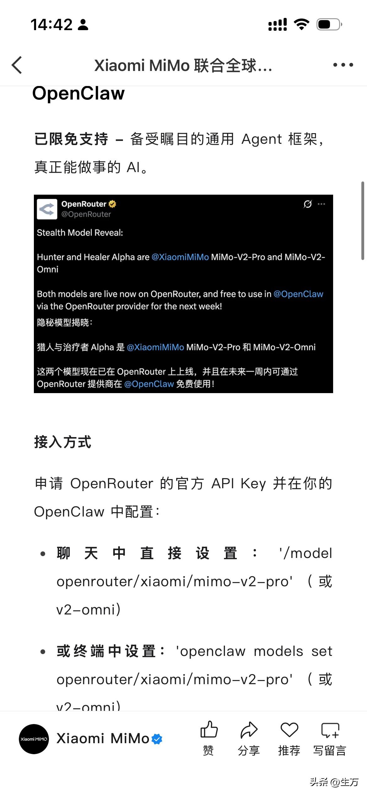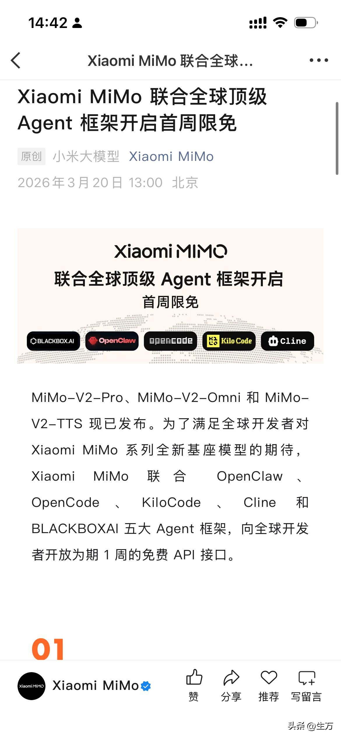 雷军:小米大模型,联合世界五大主流框架,开启头一周免费活动! 就在刚才,雷军在社交网络晒出了小米大模型最新的进展,不知道他们是通过什么样的方式,居然能够和全球目前最主流的这五个agent 框架,达成合作,让国内的开发者可以享受一周的免费时间! 当然,为了让普通老百姓也能看得懂,小米大模型把相应的详细接入方式给介绍出来了,毕竟每一个框架公司的接入方式和条件都不一样。 但不管怎么说,这个东西对于普通老百姓来说还是没有多大的作用,现在好多人基本上已经看懂了,所谓的养龙虾对于普通人来说是没有意义的。 所以即便是有再长时间的优惠,对于普通人来说,门槛还是太高了,不如让行业类的人慢慢地把这方面的专业技术转化出来,不过现在这条路还很长。 所以这一次,小米大模型做的这些努力,也是针对行业类的开发者来说有意义,对于开发者和从业者来说,这相当于就是送给他们的福利了。 当然有感兴趣的小伙伴也可以看一看,从第三张图片开始有详细的接入介绍,说不定你也能看懂了。