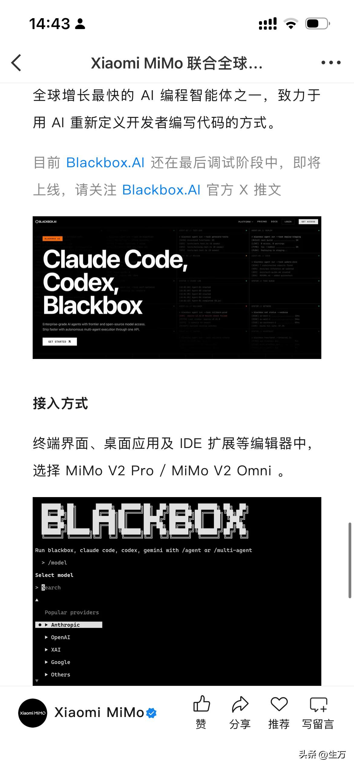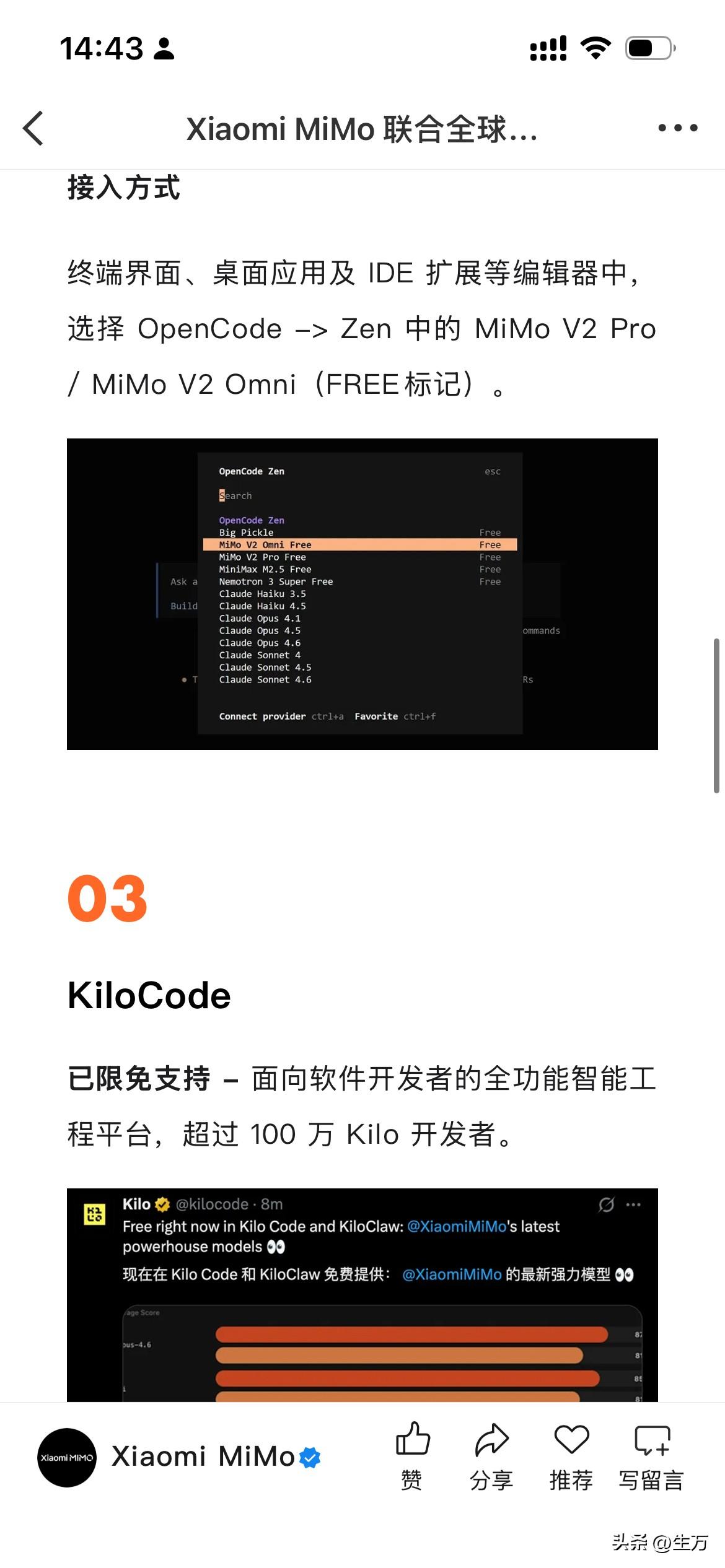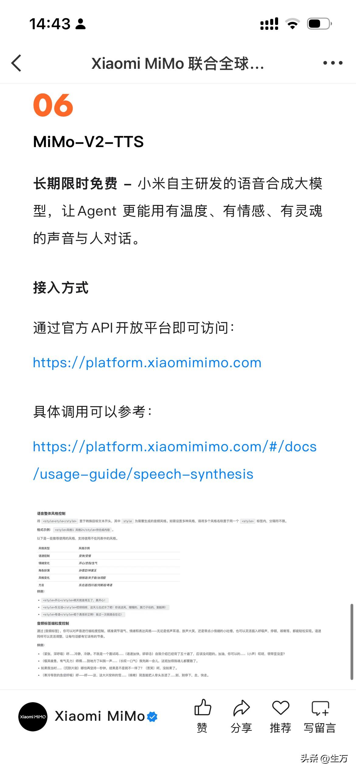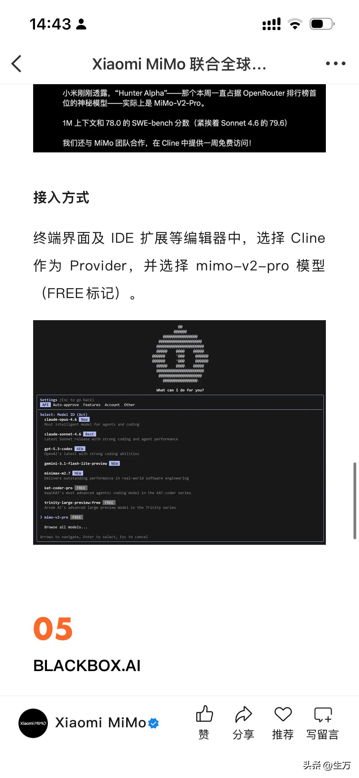 雷军:小米大模型,联合世界五大主流框架,开启头一周免费活动! 就在刚才,雷军在社交网络晒出了小米大模型最新的进展,不知道他们是通过什么样的方式,居然能够和全球目前最主流的这五个agent 框架,达成合作,让国内的开发者可以享受一周的免费时间! 当然,为了让普通老百姓也能看得懂,小米大模型把相应的详细接入方式给介绍出来了,毕竟每一个框架公司的接入方式和条件都不一样。 但不管怎么说,这个东西对于普通老百姓来说还是没有多大的作用,现在好多人基本上已经看懂了,所谓的养龙虾对于普通人来说是没有意义的。 所以即便是有再长时间的优惠,对于普通人来说,门槛还是太高了,不如让行业类的人慢慢地把这方面的专业技术转化出来,不过现在这条路还很长。 所以这一次,小米大模型做的这些努力,也是针对行业类的开发者来说有意义,对于开发者和从业者来说,这相当于就是送给他们的福利了。 当然有感兴趣的小伙伴也可以看一看,从第三张图片开始有详细的接入介绍,说不定你也能看懂了。