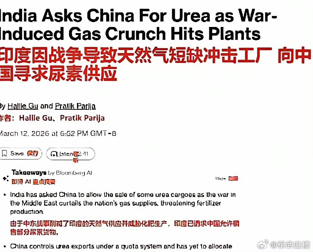 兄弟们,印度人的脑回路你永远看不懂因为霍尔木兹海峡被封锁,印度国内化肥短缺,然后就想着从中国进口化肥,可是现在中国已经收紧了化肥出口,所以印度不好进口然后印度来了波神操作,他们不是求中国放开出口,而是要求中国放开出口,听懂了吧?是要求中国放开出口美媒称伊朗导弹袭击美英印度洋基地曝有油轮已向伊朗付200万美元过路费美伊以冲突