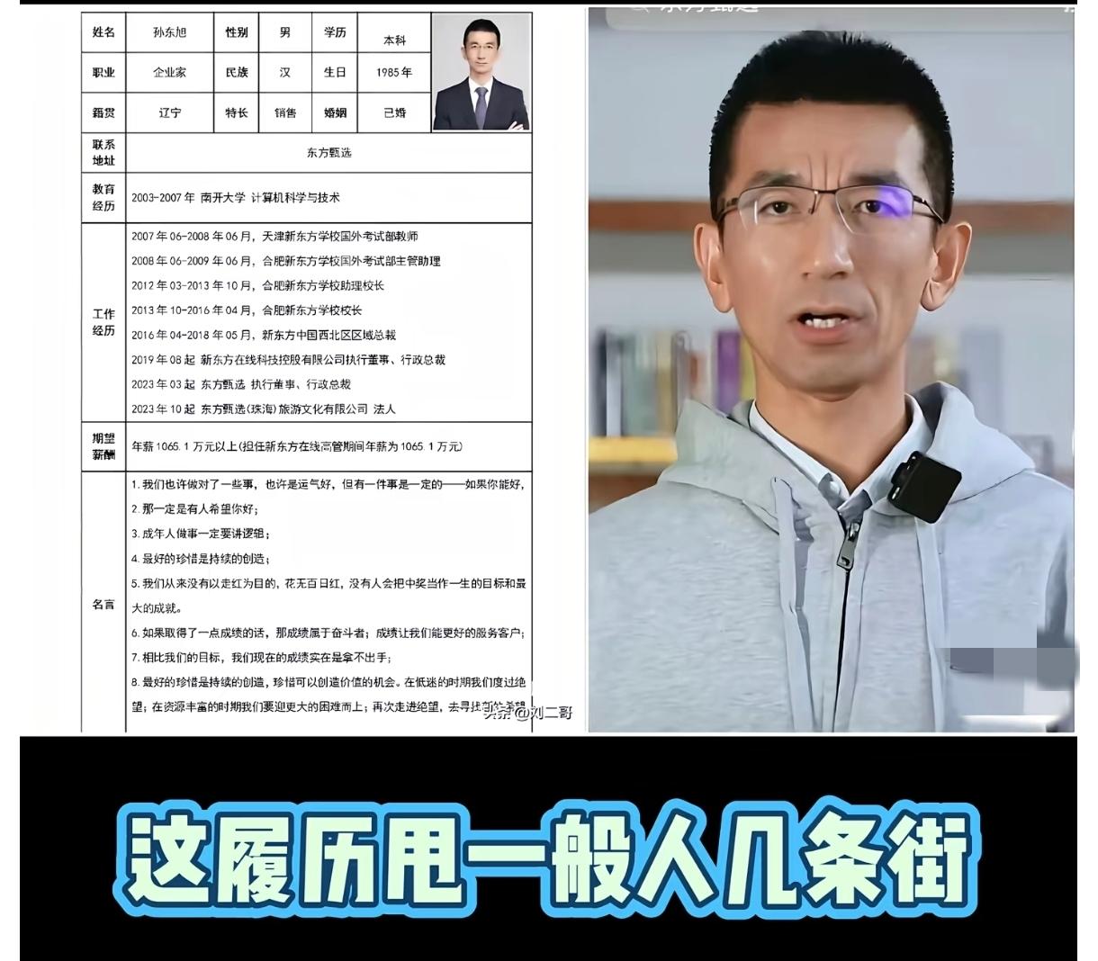 从俞老师给东方某选物色新的总裁叫孙进可以看出来这个公司的一个现象。那就是,公司内部提拔的管理人员都是兢兢业业,任劳任怨,工作了很长时间的老黄牛。之前东方某选的总裁孙东旭(昵称孙美丽),2007年就加入了公司,直到2025年离职,工作了将近18年,他的收获是最大的,因为持有公司股份,所以有了上亿的身价,财富自由后离职也算是职场圆满。 而这个孙进工作了20年后,才从公司副总裁升任东方某选总裁,他在公司的工龄比孙东旭还长。 所以从这里可以看出来,一个人的职场发展最好的只有两条路:第一条路就是像孙东旭和孙进一样,在一个公司里努力工作,慢慢升职。 第二条路就是跳槽,这是职场升职最快,最便捷的路径。当然这里面也要有个人能力做支撑,没有个人能力,也跳不了槽,也升不了职。