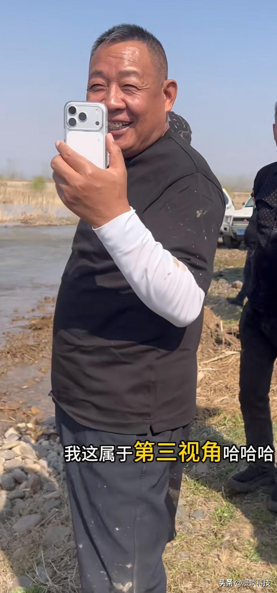 于东来用的手机是白色钛金属iPhone,而且带着保护壳,我感觉是iPhone 15 Pro Max或者iPhone 16 Pro Max。 于总退休后,喜欢游山玩水,活得太通透了。iPhone在视频拍摄方面的优秀是公认的,用苹果妥妥没毛病。