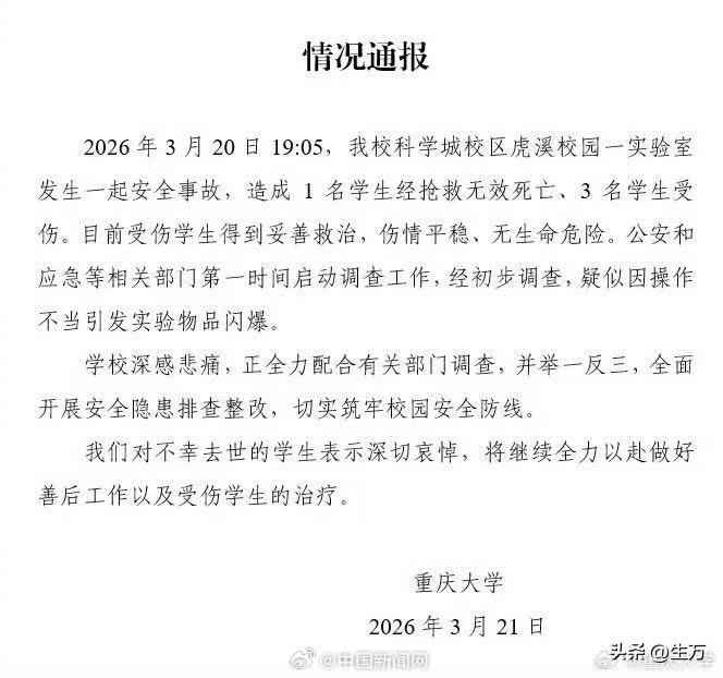 中国新闻网:重庆大学通报实验室事故,对去世学生表示哀悼! 今天晚上10:33,中国新闻网官方社交账号,发了一条重庆大学的情况,在重庆大学科学城校区虎溪校园里面,疑似因操作不当引起了闪爆事故! 这个通报内容并没有透露,到底是做的什么实验,也没有详细的介绍,这些学生到底是本科生研究生还是博士生等等,因为这个事情还在调查之中。 实验室的安全措施是非常重要的,尤其是对一些会有安全情况发生的实验,在前期就一定要做好相关的工作才行,这个事情也相关行业的从业者又提个醒,安全无小事,不管是做实验还是做生产还是做研发,都要把这个事情放在首要位置才行。 无论是个人家庭,培养一个人才都是相当不容易的,所以更应该把安全工作常抓不懈才行,不管是那个物品的不安全状态,还是人的不安全行为,在试验前的安全评估,在试验的过程中及时地发现各种安全隐患,以及对于突发安全事故的处理能力,都应该在平时做好预防工作才行。